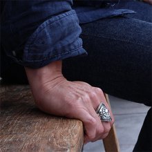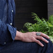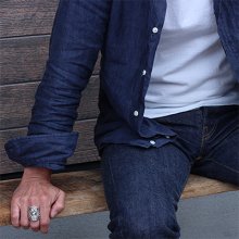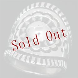 | NAVAJO/ナバホ族のアーティスト Harrison Jim/ハリソン・ジムに制作を依頼したリングです。 バンプアウトによる凹凸のある立体的な作品を制作して頂きました。重厚感のある肉厚のシルバーはインゴットになり、シルバープレートにはない良さを感じます。 迫力のある最大31mm幅は21号を付けられるサイズの方であれば、着け負けもしない男性らしいスタイルを楽しめる作品です。 ボトムはテーパー付きとなりますので指の曲げやすさも備えており、スタイリッシュなフォルムは大変魅力的です。 | ||