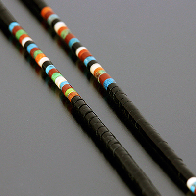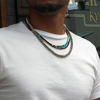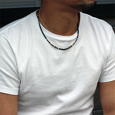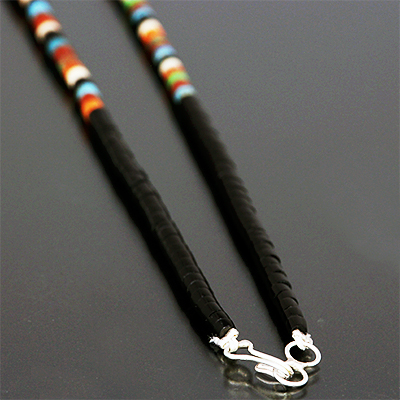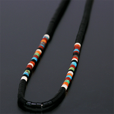 | SANTO DOMINGO/サントドミンゴ族のアーティスト Dorene Calabaza/ドレネー・カラバザが制作したヒシ ネックレスです。 ターコイズ・ジェット・シェルなどの天然の素材を研磨し繋ぎ合わせた、サントドミンゴに古くから伝わる技法を用いて製作されています。 独特の配色はシーズンを問わずアクセントになります。 | ||