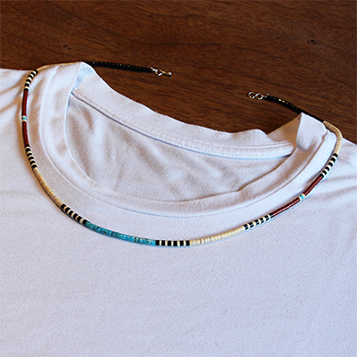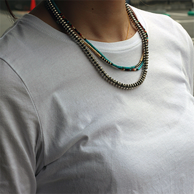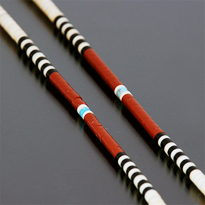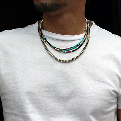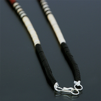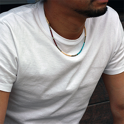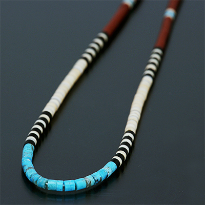 | SANTO DOMINGO/サントドミンゴ族のアーティスト Dorene Calabaza/ドレネー・カラバザが制作したヒシ ネックレスです。 ターコイズ・ジェット・シェルなどの天然の素材を研磨し繋ぎ合わせた、サントドミンゴに古くから伝わる技法を用いて製作されています。 独特の配色はシーズンを問わずアクセントになります。 | ||