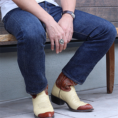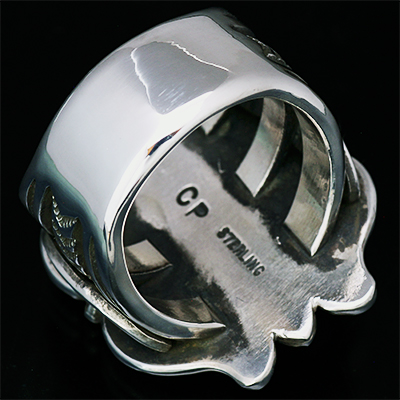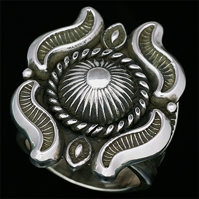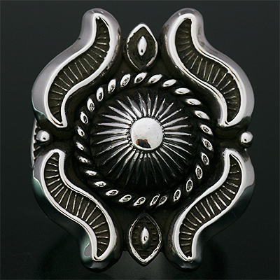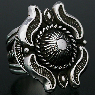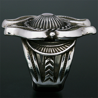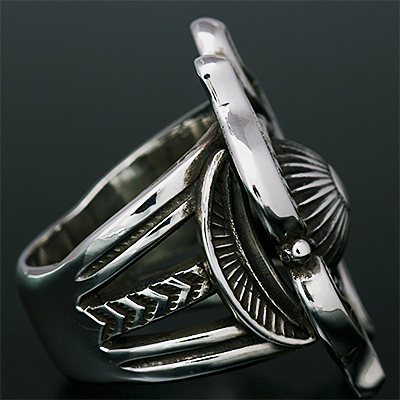 | Navajo/ナバホ族のアーティスト Clendon Pete/クレンドン・ピートに制作を依頼したリングです。 クレンドン自身が愛用するケトーデザインのペンダントをベースに制作して頂いた作品です。 こちらの作品は一つずつパーツを制作し、プラモデルの用に組み立てて成形していくので手間と時間が掛かります。 着用した時の高さは思っているより低いため納まりが良く着け心地の良い作品です。各サイズ(22号、20号、18号)仕上がっています。 | ||