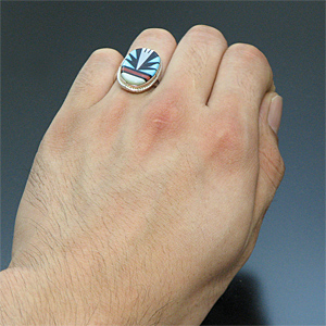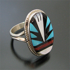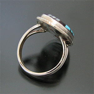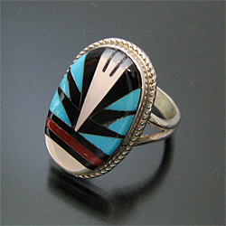 | ZUNI/ズニ族のアーティストが制作したリングです。 カッティングを施した石をはめ込んで図柄を完成させる技法インレイ で制作されており、色とりどりの天然石が巧みに使われている、個性&センスが感じられる仕上がりとなっています♪ オーソドックスなズニのインレイスタイルのリングで、ターコイズやコーラルはもちろん白蝶貝やイエローシェルなどを削り合わせ複雑な柄を形成しています。全て手作業で行われる為、同じ柄が色が存在しないのも魅力的です♪ | ||