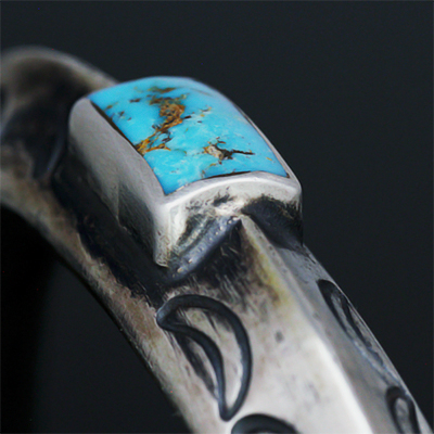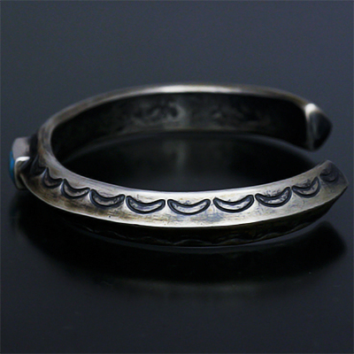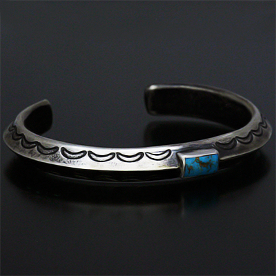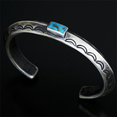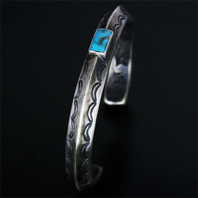 | Creek/クリーク族のアーティスト Jesse Robbins/ジェシー・ロビンズが制作したバングルです。 コインシルバーから成形された地金はトライアングルになっており、センターにセットされた石は自らが採掘し厳選したシャイアンを使用しています。トライアングルの形状にセットされたベゼルは見事に一体感が生み出され、作品をシャープに見せています。 素材の良さとジェシーが手掛けるオールドスタイルが上手く組み合わさっています。 ジェシー・ロビンズの世界観をどうぞお楽しみください。 | ||