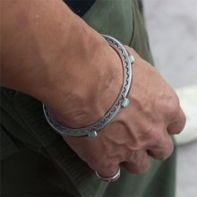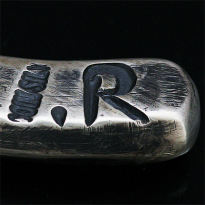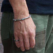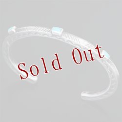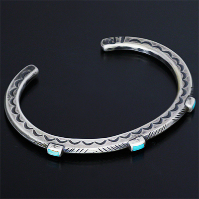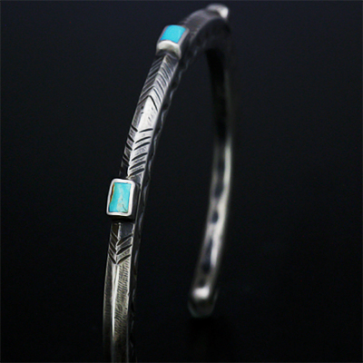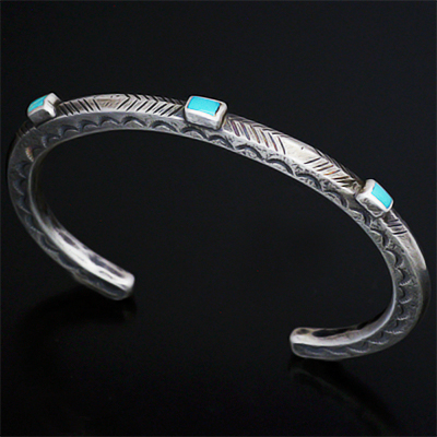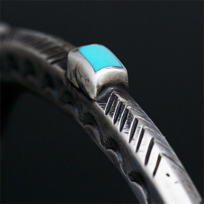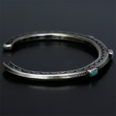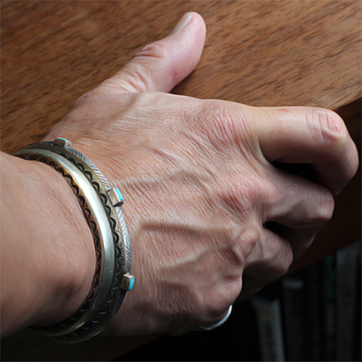 | Creek/クリーク族のアーティスト Jesse Robbins/ジェシー・ロビンズが制作したバングルです。 コインシルバーから成形された幅が細く厚みのある地金は重ね着けに重宝する作品で、古き良きクラシックスタイルを表現しています。 石は自らが採掘し厳選したシャイアンを使用しており、トライアングルの形状にセットされたベゼルは見事に一体感が生み出されています。素材の良さとジェシーが手掛けるオールドスタイルが上手く組み合わさっています。 ジェシー・ロビンズの世界観をどうぞお楽しみください。 | ||