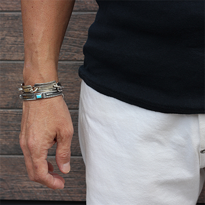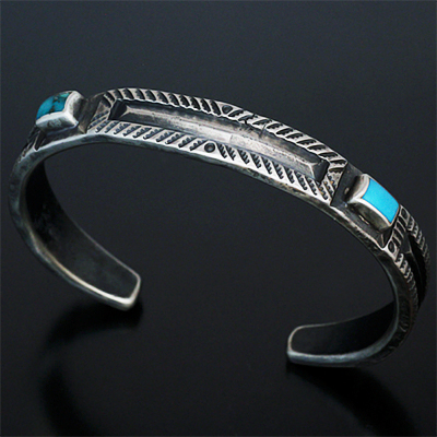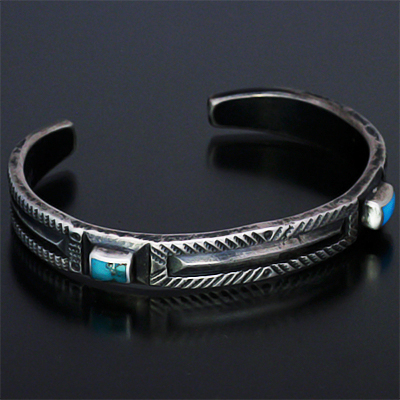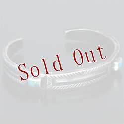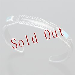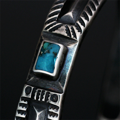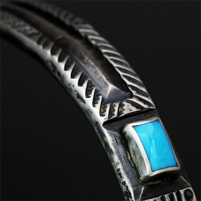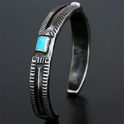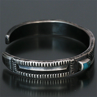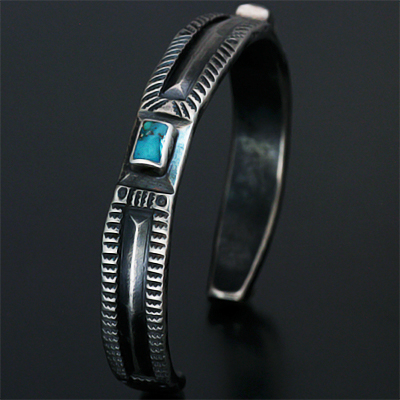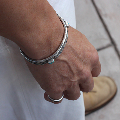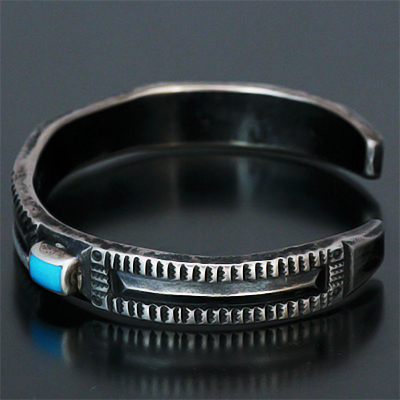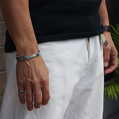 | Creek/クリーク族のアーティスト Jesse Robbins/ジェシー・ロビンズが制作したバングルです。 コインシルバーから成形された地金は単体でも重ね着けにも重宝する細身の幅になります。クラシックスタイルにバランスよくセットされたターコイズは自らが採掘し厳選したシャイアンを使用しています。飽きの来ないスタイルは年齢を問わずご愛用して頂ける作品です。 素材の良さとジェシーが手掛けるオールドスタイルが上手く組み合わさっています。 ジェシー・ロビンズの世界観をどうぞお楽しみください。 | ||