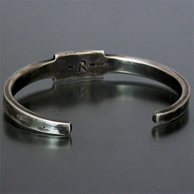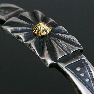 | Creek/クリーク族のアーティスト Jesse Robbins/ジェシー・ロビンズが制作したバングルです。 コインシルバーから成形された地金はサンバーストにデザインされ、18Kシェルコンチョをセンターにセットして頂きました。コンパクトなサイズ感ながらもしっかりとした厚みを感じ、ジェシーの特徴でもある内側のエッジを落とした柔らかいアールが着けた時の肌あたりを心地よく感じさせます。 素材の良さとジェシーが手掛けるオールドスタイルが上手く組み合わさっています。 幅広い層から支持を得ているジェシー・ロビンズの世界観をどうぞお楽しみください。 | ||