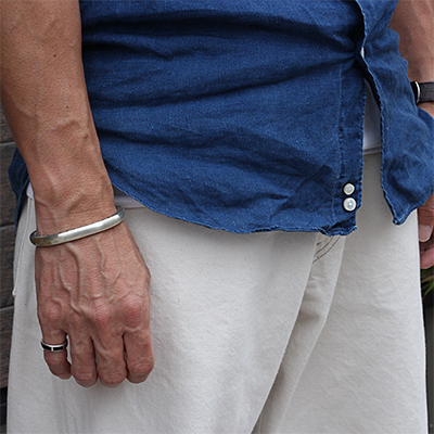 | Creek/クリーク族のアーティスト Jesse Robbins/ジェシー・ロビンズが制作したバングルです。 コインシルバーから成形された地金はハーフラウンド状になっており、ジェシーの特徴でもある内側のエッジを落とした柔らかいアールが着けた時の肌あたりを心地よく感じさせます。シンプルに素材の良さに重厚感のある厚みもたせ、両サイドにスタンプが施された簡素なデザインは単体でも重ね着けにも相性良く組み合わせて頂ける作品です。 幅広い層から支持を得ているジェシー・ロビンズの世界観をどうぞお楽しみください。 | ||