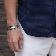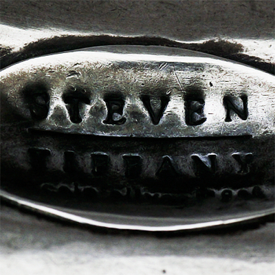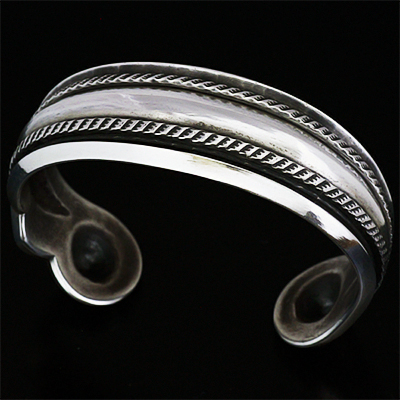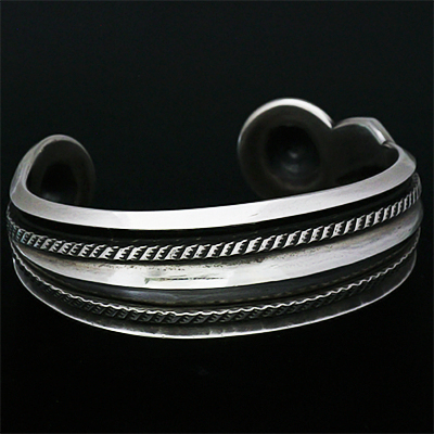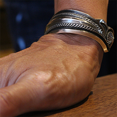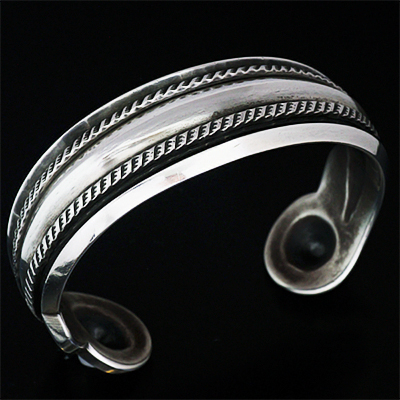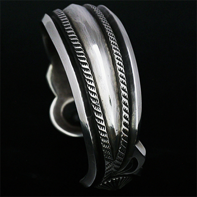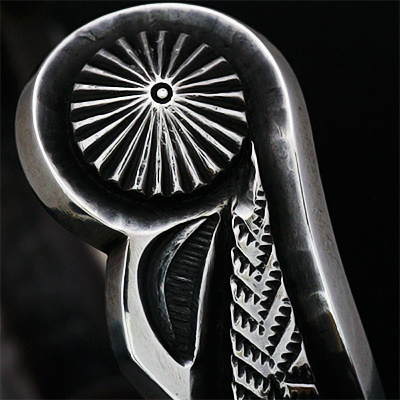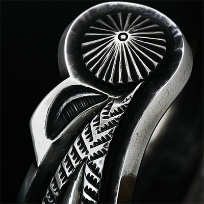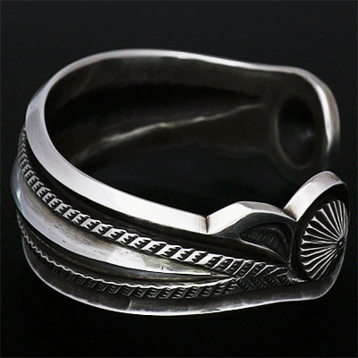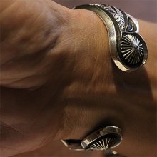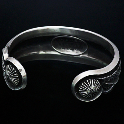 | Southern Paiute/サウスパイユート族のSteven Tiffany/スティーブン・ティファニーに制作を依頼したバングルです。 裏側から叩いて盛り上げ、トライアングル状になった部分はヤスリがけだけではなく、James Faaksでもお馴染みのチェイシング技術によって表面に角度を付けてさらに盛り上げています。 ターミナルには2つのコンチョが施されていますが、こちらもリポウズによるもので、まるで付けたような感覚になるほどの立体感です。 またスペースを持て余すことなく際までに施されたターミナルのスタンプはミスが許されない部分ですが、狂いなく正確に仕上げられおり、デザインに奥深さを感じます。 一つ一つの技術が組合わされ完成されたスティーブンの唯一無二の作品をお楽しみください。 | ||
