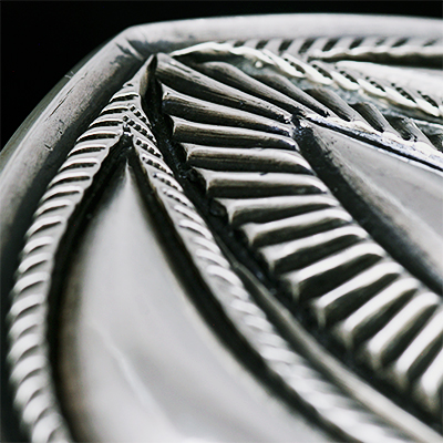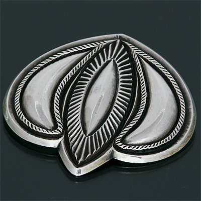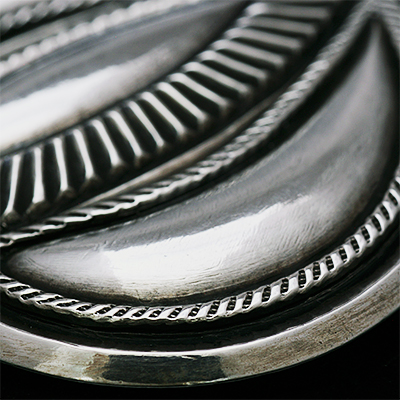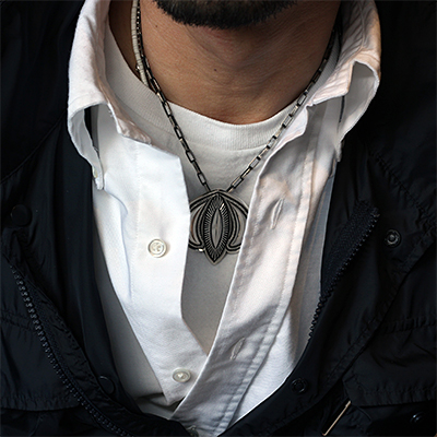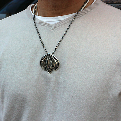 | Southern Paiute/サウスパイユート族のSteven Tiffany/スティーブン・ティファニーに制作を依頼したペンダントです。 美し曲線からリポウズにスタンプ、裏側からの打ち出しに加えて表側に丁寧に施されたファイルワーク、そしてスタンプワークがあって生れる作品です。 まるで後付けの様に浮き上がって見えるサンバーストはリポウズによるスティーブンの技術が詰まった部分で、溝を作り一つ一つヤスリで整えていく大変時間と手間の掛かる作業で仕上げられています。 内側はハンマーで叩き緩やかに膨らんだリポウズ、叩いた後がしっかりと残っており、丁寧な仕事が垣間見える部分です。 溶かしたコインシルバーを巧みに操る彼だからこそ成せる特別な作品です。 | ||
