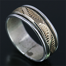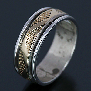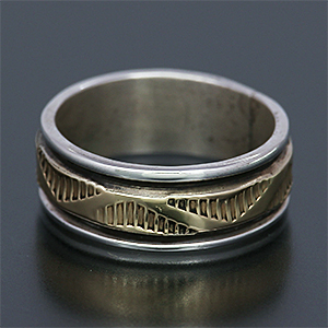 | NAVAJO/ナバホ族のアーティスト Bruce Morgan/ブルース・モーガンに制作依頼をしたリングです。 シルバーに14Kをオーバーレイさせたブルースの代表的スタイルの作品です。デザインは生命の源とされているウォーターウエーブ(水)を表現しています。 普段アクセサリーを着けられていない方でも安心してスタイルをお楽しみ頂けます。 | ||