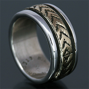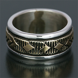 | NAVAJO/ナバホ族のアーティスト Bruce Morgan/ブルース・モーガンに制作依頼をしたリングです。 シルバーに14Kゴールドを組み合わせた作品、当店企画の4つのダイヤとアローを組み合わせたデザインです。4の数字は縁起のいいものとされており、季節、方角、人生を表しています。着けやすい幅は服装を選ばない万能型でもあり、シンプルの中に映える優しいゴールドの色味がいいアクセントとして効いています。普段アクセサリーを着けられない方でも安心してスタイリングをお楽しみただける作品です。 | ||
