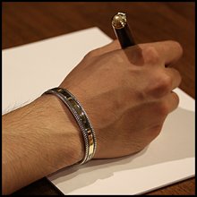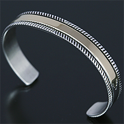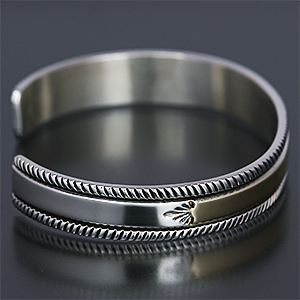 | NAVAJO/ナバホ族のアーティスト Bruce Morgan/ブルース・モーガンに制作を依頼したバングルです。 シルバーに14Kをオーバーレイさせたブルースの代表的スタイルの作品です。デザインは伝統的スタイルのチゼルワークと呼ばれるタガネ(鉄の先を鋭く削ったノミ、彫刻刀のようなもの)を用いて仕上げられています。 普段アクセサリーを着けられていない方にも安心してスタイルして頂ける作品で、単体または重ね着けにも重宝するアイテムです。男女問わずお楽しみください。 | ||