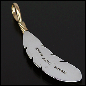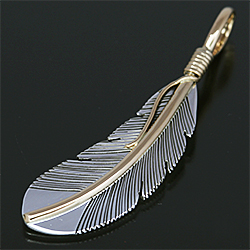 | NAVAJO/ナバホ族のアーティスト Harvey Mace/ハーヴィー・メイスに制作を依頼したペンダントです。 躍動感のあるフェザーモチーフの作品です。 センターラインは12KGF(12金張り)が使用されているため、上品で落ち着いた雰囲気があります。また、シルバーとのカラーバランスが絶妙です。 美しい曲線と共にフェザーがしっかりとデザインされていますので、どなたでもお楽しみ頂ける作品です。 | ||