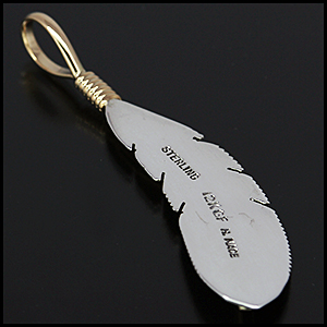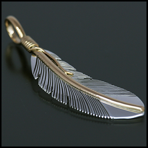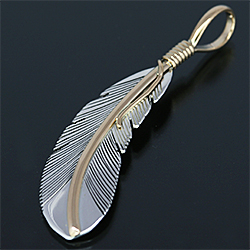 | NAVAJO/ナバホ族のアーティスト Harvey Mace/ハーヴィー・メイスに制作を依頼したペンダントです。 躍動感のあるフェザーモチーフの作品です。 センターラインは12KGF(12金張り)が使用されているため、上品で落ち着いた雰囲気があります。また、シルバーとのカラーバランスが絶妙です。 美しい曲線と共にフェザーがしっかりとデザインされていますので、どなたでもお楽しみ頂ける作品です。 | ||