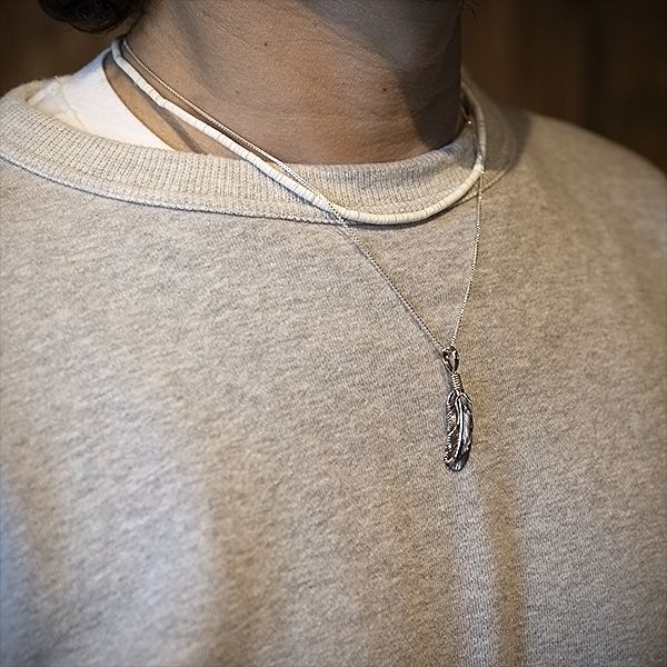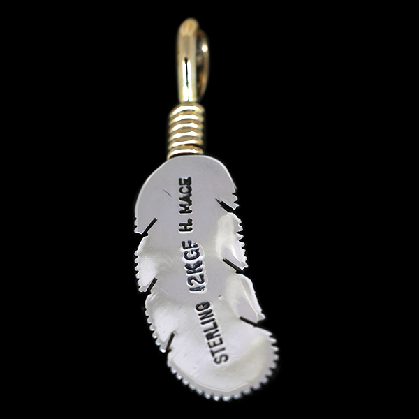 | NAVAJO/ナバホ族のアーティスト Harvey Mace/ハーヴィー・メイスに制作を依頼したペンダントです。 躍動感のあるフェザーモチーフの作品です。センターラインは12KGF(12金張り)が入っているため、洗練された落ち着いた魅力があり、シルバーとのバランスも絶妙です。 美しい曲線と共にフェザーがしっかりとデザインされていますので、どなたでもお楽しみ頂けるペンダントです。 |