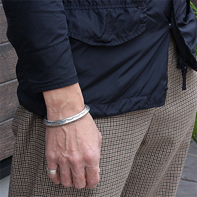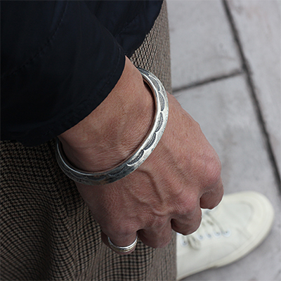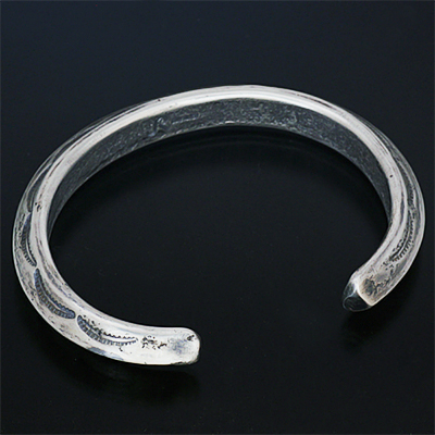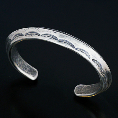 | Creek/クリーク族のアーティスト Jesse Robbins/ジェシー・ロビンズに制作依頼をしたバングルです。 コインシルバーから成形された地金、多くのカスタマーに愛されるクラシックスタイル、トライアングルの形状になっているため高さがあり、重ね着けにも活躍するアイテムでもあります。 また内側は丁寧にアールをつけているためソフトな着け心地を堪能して頂けます。 厚みのある地金にしっかり打ち込まれたスタンプは大胆であり、古き良きスタイルを大切にしているジェシー・ロビンズならではの世界観が表れています。 | ||
