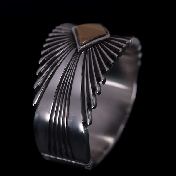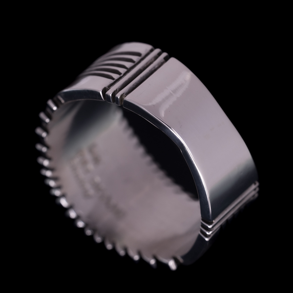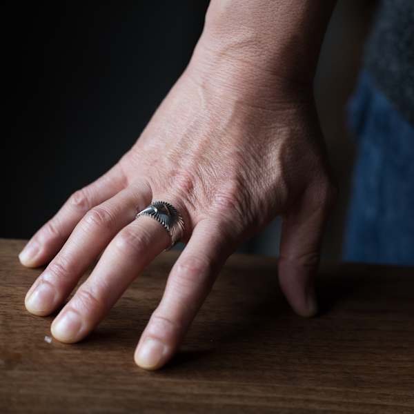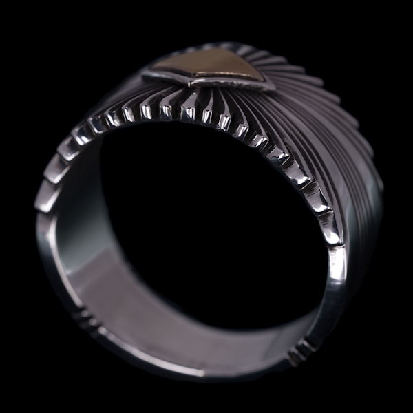 | NAVAJO/ナバホ族のアーティスト Patricia Bedonie/パトリシア・ベドニーに制作依頼をしたリングです。 正確で美しいチゼルワークによるサンバーストデザインです。ダイヤ型のパーツは14Kを使用し、シルバーとのツートンカラーで表現されています。側面は凹凸が鋭いエッジが効果的で、形状はテーパーになっているため指あたりがとてもよく、装着感の良いリングです。 男女問わず長年愛され続けられているリングで、ペアで持たれる方も多くいらっしゃいます。洋服にも取り入れやすい作品で、アクセントとしても使い勝手の良いアイテムです。 |
