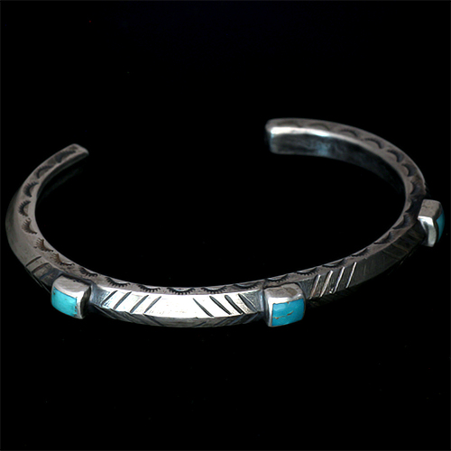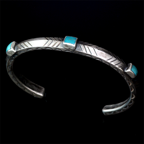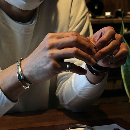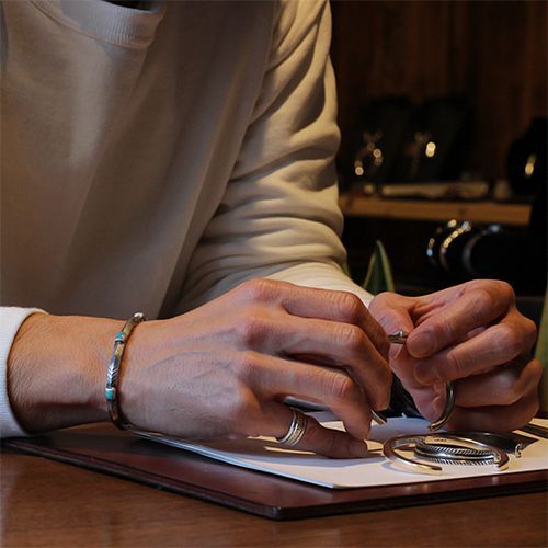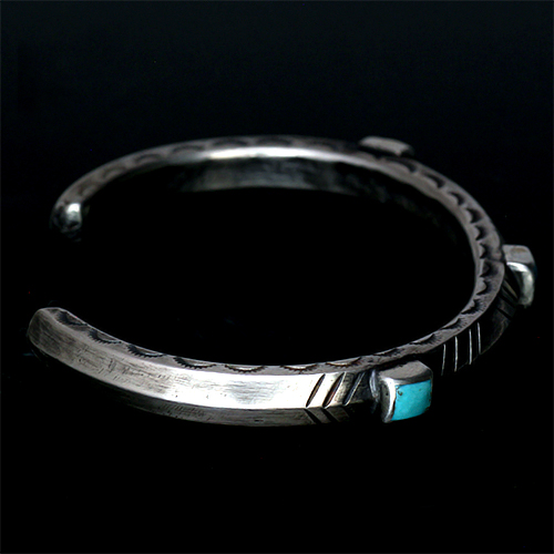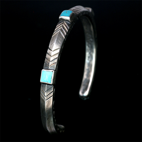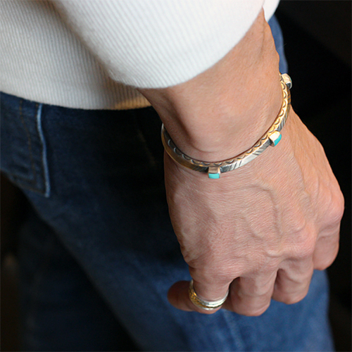 | Creek/クリーク族のアーティスト Jesse Robbins/ジェシー・ロビンズが制作したバングルです。 細くしっかりした厚みのあるトライアングルは他のバングルとの2連、3連など重ね付けにも重宝する作品ですが、単体でお使いの際はさりげなくスタイルをお楽しみ頂けるシンプルさを兼ね備えています。また、3つのシャイアン(ターコイズ)があることで物足りなさを感じさせない安心感もあります。 石は自らが採掘し厳選したシャイアンを使用しており、トライアングルの形状にセットされたベゼルは見事に一体感が生み出されています。素材の良さとジェシーが手掛けるオールドスタイルが上手く組み合わさっています。ジェシー・ロビンズの世界観をどうぞお楽しみください。 | ||