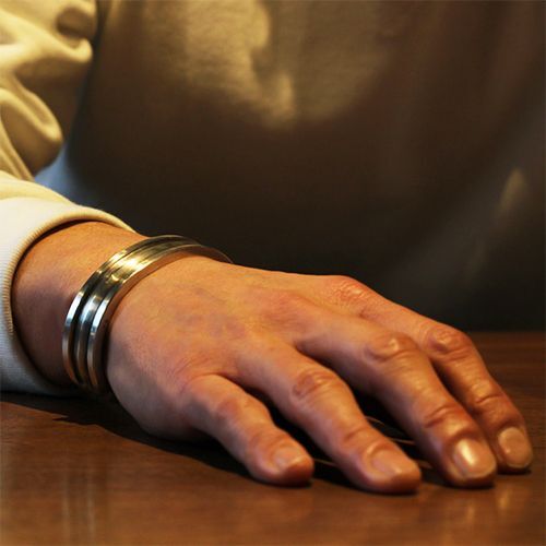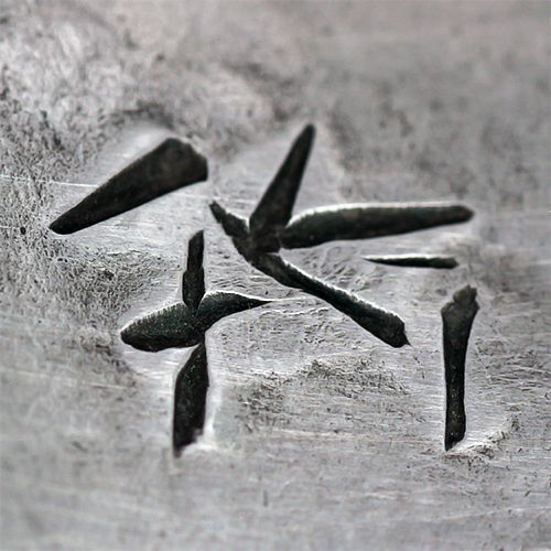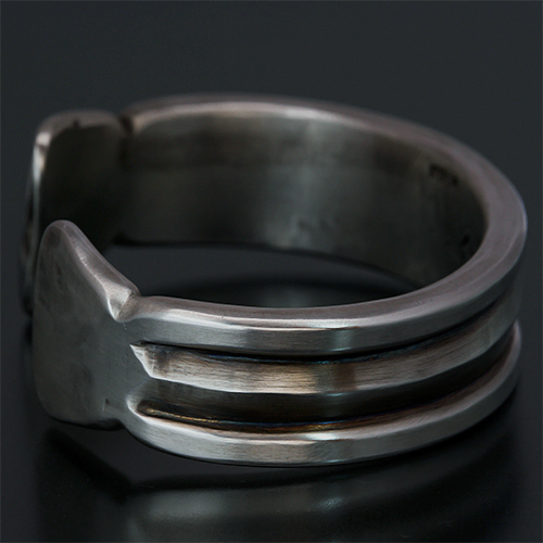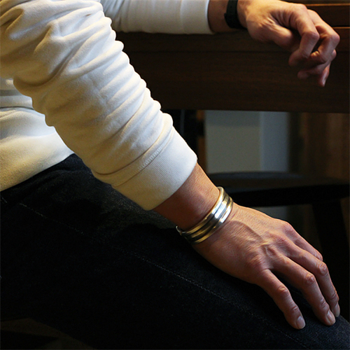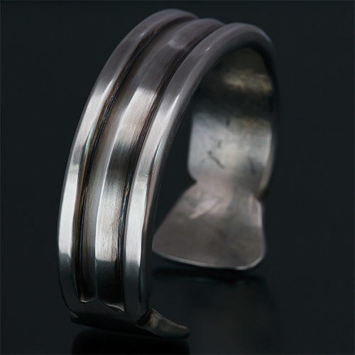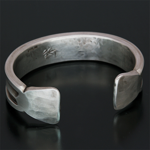 | Blackfoot/ブラックフット族のJames Faks/ジェームス・フォックスに制作を依頼しバングルです。 両サイドに向けて押し下げながら中心をトライアングル状に仕上げられているチェイシングと呼ばれる技術が用いられています。タガネを少しずつハンマーで叩きながら動かしていくため断面に凹凸が生まれています。 ゴツゴツとした分厚いシルバーの塊のようなバングルですが、エッジの処理など細かいところまで行き届いていますので、装着感はとても柔らかく感じます。ターミナルはハンマーで叩かれ薄くされているのが特徴で、幅が一番広い箇所でもあり着けた時のホールド感がしっかりと感じます。また叩いた跡がデザインにもなる簡素なお洒落です。 シンプルで派手さはない分スタイルに自然に溶け込む作品です。 | ||