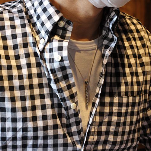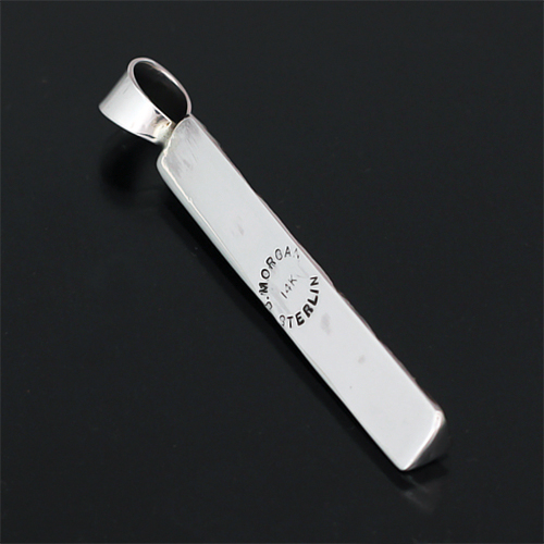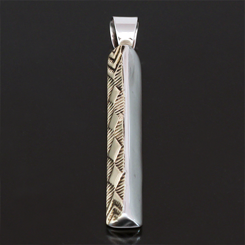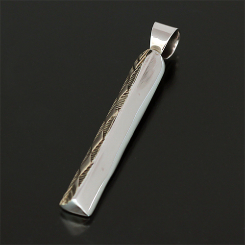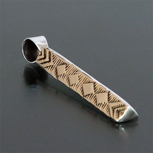 | NAVAJO/ナバホ族のアーティスト Bruce Morgan/ブルース・モーガンに制作を依頼したペンダントです。 RIVER MAIL企画による三角形の形状を活かして、14Kゴールド(ダイヤ)、シルバー(プレーン)と片面ずつ異なった素材とスタイルを組合わせたコンビペンダントになります。デザインは4つのダイヤにアローが組み合わさっています。 バーの長さとトライアングルバーの厚みとのバランスを考えて提案致しました。 |
