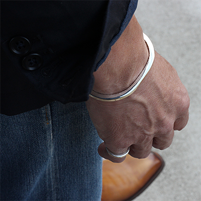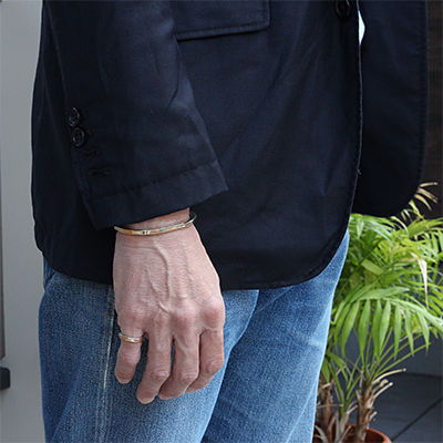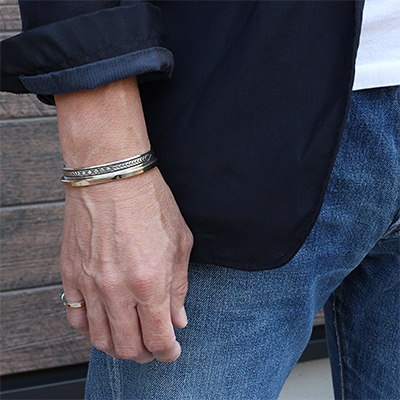 | NAVAJO/ナバホ族のアーティスト Bruce Morgan/ブルース・モーガンに制作を依頼したバングルです。 RIVER MAILの企画による#6スクエアワイヤーを使用した作品です。 厚み幅ともに約4mmのシルバーワイヤーを使用しており、トップ部分に14Kをオーバーレイしています。 表側は簡素な美が追及されたプレーンスタイル、裏側に4ダイヤ+アローのデザインを施して頂いています。 単体でお使い頂くのも良いですが、他のバングルと重ね着けにも重宝する作品です。 |