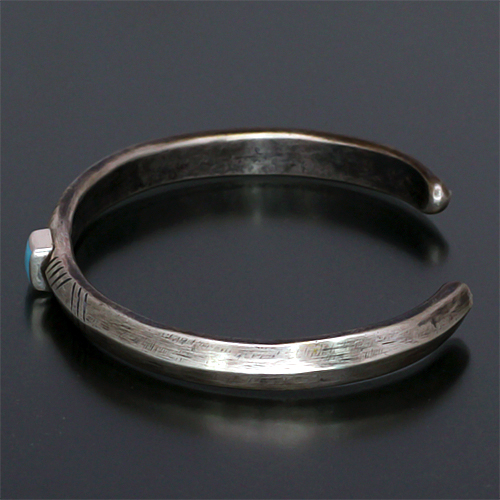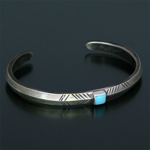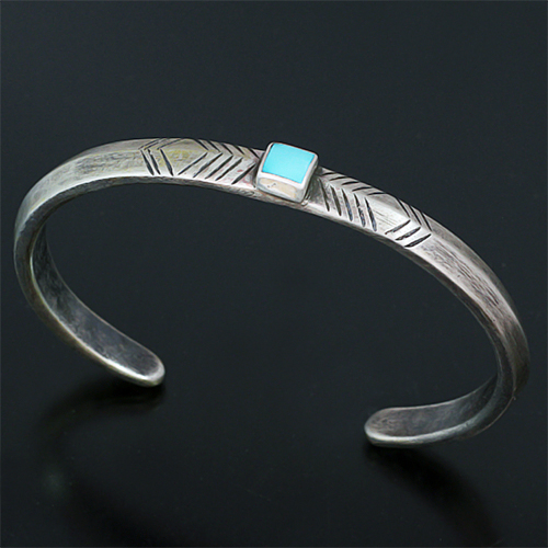 | Creek/クリーク族のアーティスト Jesse Robbins/ジェシー・ロビンズが制作したバングルです。 コインシルバーから成形された地金は断面が三角形の形状になっています。細くしっかりした厚みのあるトライアングルは他のバングルとの2連、3連など重ね付けにも重宝する作品ですが、単体でお使いの際はさりげなくスタイルをお楽しみ頂けるシンプルさを兼ね備えています。また、シャイアン(ターコイズ)が良いアクセントになっていますので、シンプルすぎないのも安心感を感じます。 石は自らが採掘し厳選したシャイアンを使用しており、トライアングルの形状にセットされたベゼルは見事に一体感が生み出されています。素材の良さとジェシーが手掛けるオールドスタイルが上手く組み合わさっています。ジェシー・ロビンズの世界観をどうぞお楽しみください。 | ||