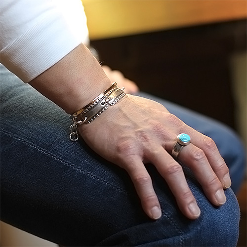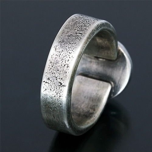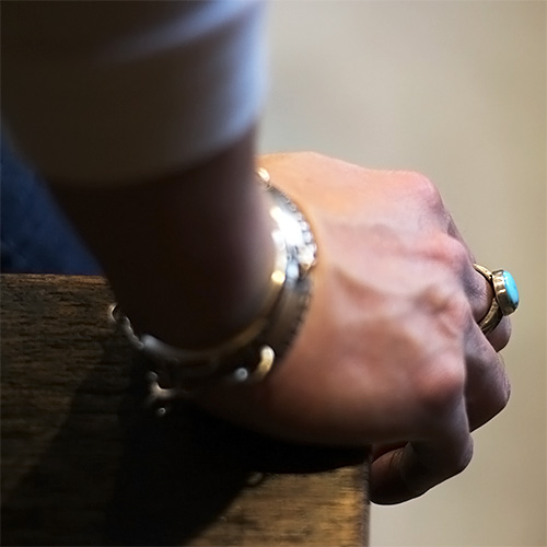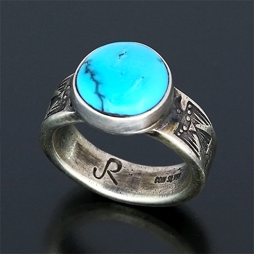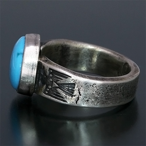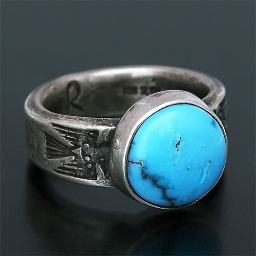 | Creek/クリーク族のアーティスト Jesse Robbins/ジェシー・ロビンズに制作依頼をしたリングです。 コインシルバーから成形された地金にサンダーバードのデザインが施され、ジェシー所有のシャイアンをセットして頂きました。古い質感と石のカラー、そしてフォルムがバランスよく合わさっています。ジェシーの特徴でもある内側のエッジを落とした柔らかいアールが着けた時の肌あたりを心地よく感じさせます。 素材の良さとジェシーが手掛けるオールドスタイルが上手く組み合わさっています。ジェシー・ロビンズの世界観をどうぞお楽しみください。 | ||