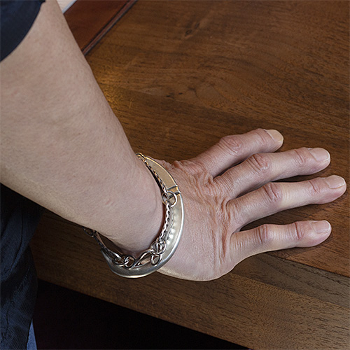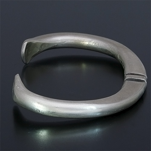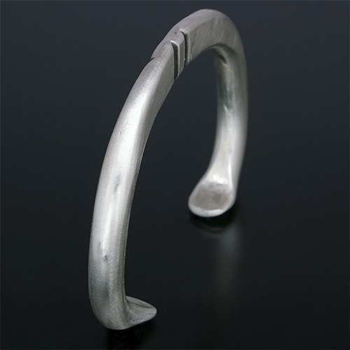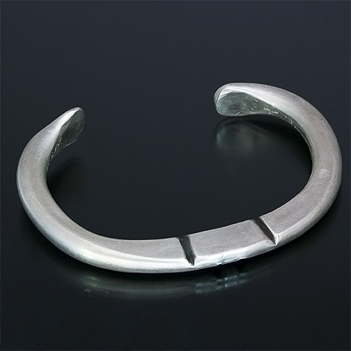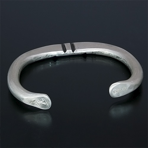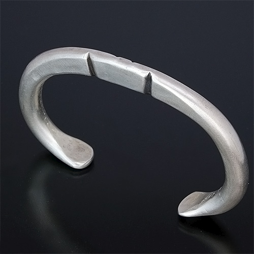 | Blackfoot/ブラックフット族のJames Faks/ジェームス・フォックスに制作を依頼しバングルです。 ラウンドワイヤーを使用したナロースタイルの作品、トップとターミナルをハンマーで叩くことによって平面に仕上げ、独特の形状が生まれています。デザインは意図的に叩かれたハンマーの跡が所々に見られ、荒々しさの中にデザインとしても取り入れられています。 洋服に合わせやすいサイズ感はとけこみ易く、シンプルに単体で着けられるのも良し、重ね着けのベースにもなるバランスの良い高さはスタイルの幅を広げれる作品です。 両サイドに付けられた溝はチェイシング技術によるもので、シンプル作品の中に映えます。 素朴で雰囲気のある鈍い光沢、昔ながらの少ない道具で仕上げるインディアンジュエリーの基本を思い出させてくれるジェームス・フォックスが手掛ける作品をお楽しみください。 |