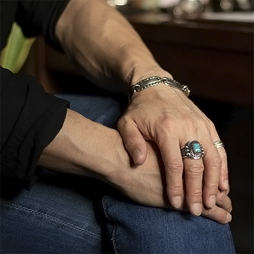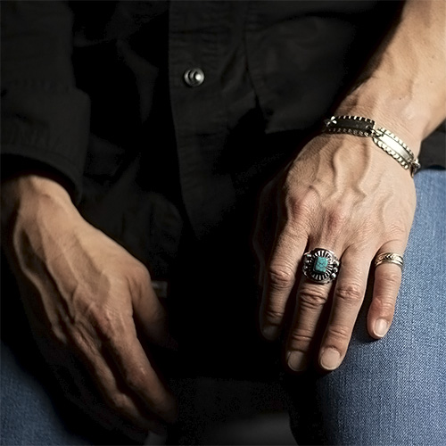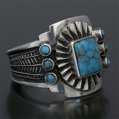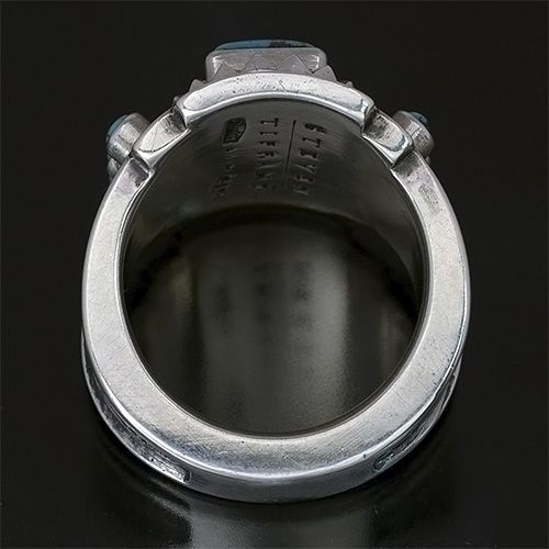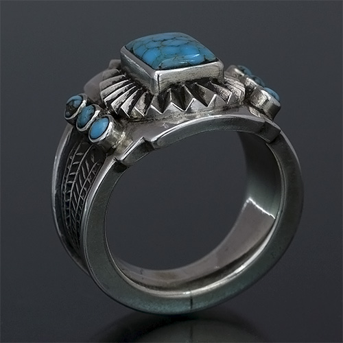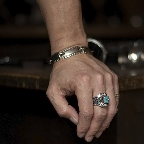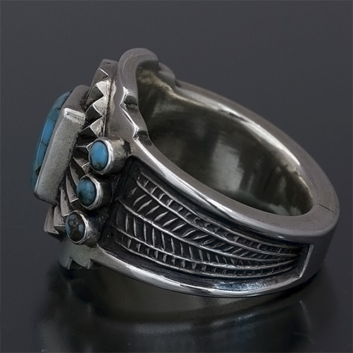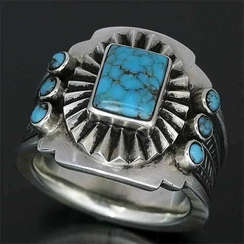 | Southern Paiute/サウスパイユートのSteven Tiffany/スティーブン・ティファニーに制作を依頼したリングです。 オールドコインから仕上げられたスティーブンによる作品、石はキングマンを使用しています。一つのパーツから出来ているような一体感のあるサンバーストはリングと2つのパーツから生まれてます。 垂直に切り立ったサンバーストのパーツをセットすることを考えボトムからトップに向けて徐々に厚みを薄くすることで石をセットした場合でも高さが極力抑えらており、作品としてのバランス、そして美しさが伝わってきます。着けるだけではなく見ても楽しめるスティーブン・ティファニーが手掛けるジュエリーの特徴でもあります。 山は高く、深い谷をイメージさせる鋭角によって生まれるサンバーストはチェイシングとやすり掛けによる時間を掛ける部分でもあります。 ボリュームを感じつつも指に馴染む納まり具合と高さを感じない落ち着きは、着けた時のバランスを考え構想されているのが良く分かります。 |