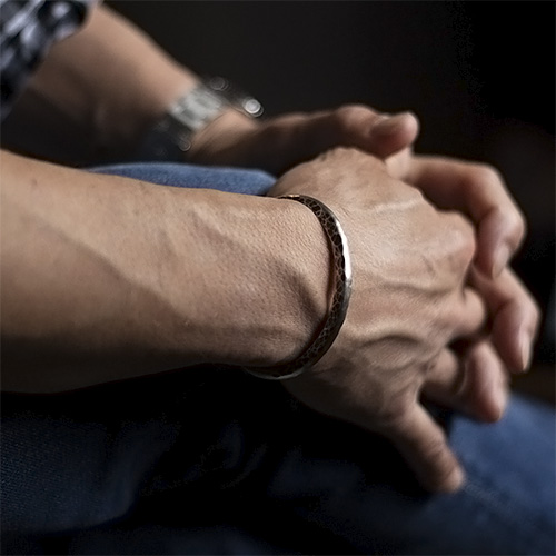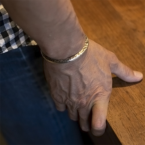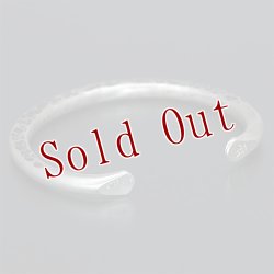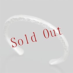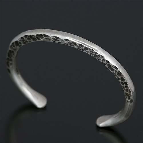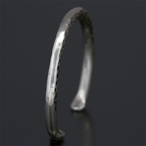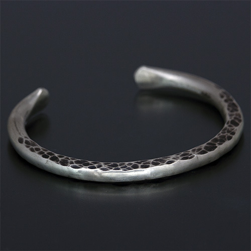 | Blackfoot/ブラックフット族のJames Faks/ジェームス・フォックスに制作を依頼したバングルです。 ラウンドワイヤーを使用したナロースタイルの作品、両サイドハンマーで叩くことによって平面に仕上げられ、独特の形状が生まれています。デザインは意図的に叩かれたハンマーの跡が所々に見られ、荒々しさの中にデザインとしても取り入れられています。 洋服に合わせやすいサイズ感はとけこみ易く、シンプルに単体で着けられるのも良し、重ね着けのベースにもなるバランスの良い高さはスタイルの幅を広げれる作品です。 素朴で雰囲気のある鈍い光沢、昔ながらの少ない道具で手掛けるインディアンジュエリーの基本を思い出させてくれるジェームス・フォックスの作品をお楽しみください。 |