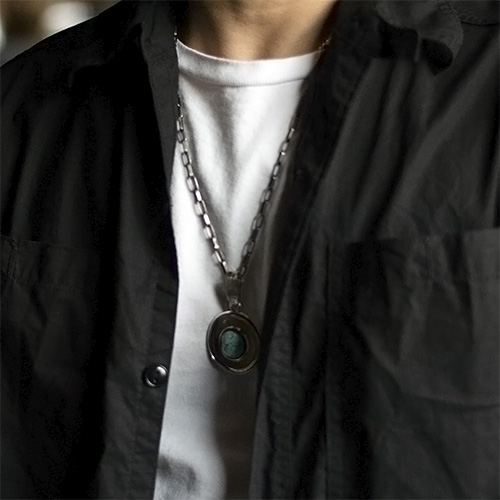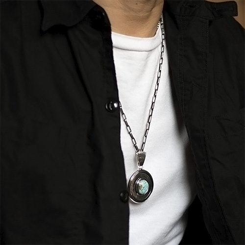 | NAVAJO/ナバホ族のアーティスト レオナルド・ネズに制作を依頼したペンダントです。 サンバーストデザインはオーバーレイによるもので、コントラストがしっかりと効いており、落ち着いた雰囲気のあるナンバーエイトとのバランスが良く、彼のスタイルがしっかりと反映されている作品です。 太めのチェーンで合わされるのがおすすめです。 |