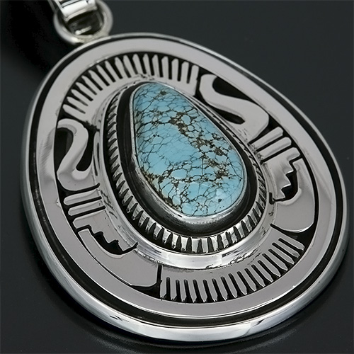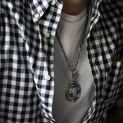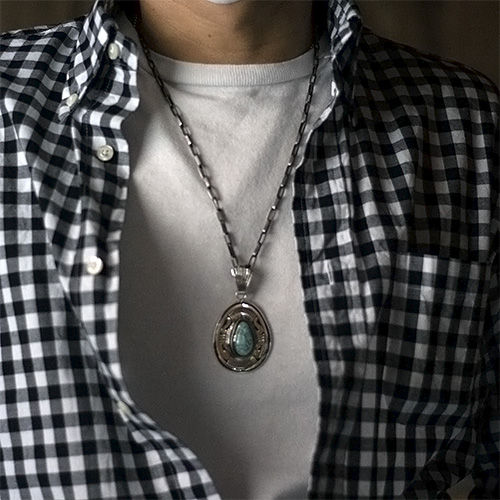 | NAVAJO/ナバホ族のアーティスト レオナルド・ネズに制作を依頼したペンダントです。 ケトーデザインはオーバーレイによるもので、コントラストがしっかりと効いており、落ち着いた雰囲気のあるナンバーエイトとのバランスが良く、彼のスタイルがしっかりと反映されている作品です。 太めのチェーンで合わされるのがおすすめです。 |