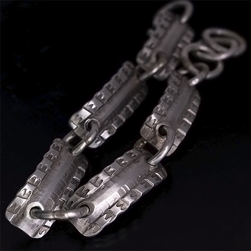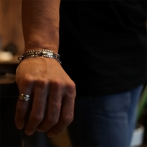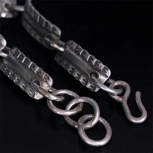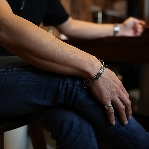 | Blackfoot/ブラックフット族のJames Faks/ジェームス・フォックスに制作を依頼したブレスレットです。 フック、丸カンからすべてのパーツは既製のパーツを使用せず、一つ一つジェームスによる手作りになります。荒々しくも簡素な美を追求する彼らしさが出ている作品です。不揃いの丸カン、ロウ付けのあと、雰囲気の良さがこのブレスレットのかっこよさに繋がっていると思います。 バングルとは異なる着け方が楽しめるのも一つ、着用感は遊びがあり動きのある着け方でお楽しみください。 |