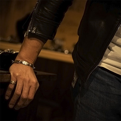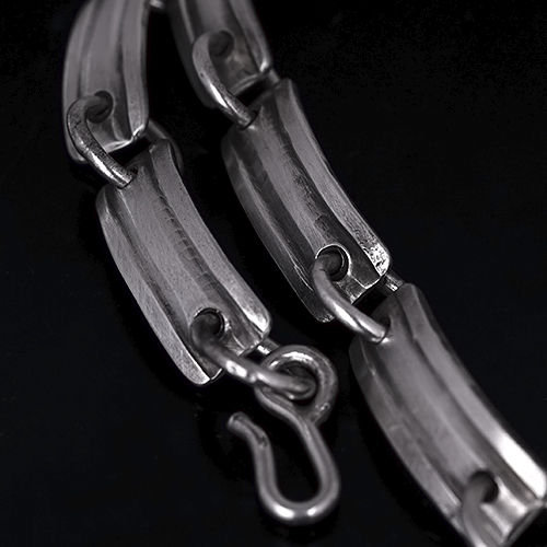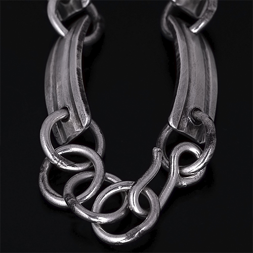 | Blackfoot/ブラックフット族のJames Faks/ジェームス・フォックスに制作を依頼したブレスレットです。 フック、丸カンからすべてのパーツは既製のパーツを使用せず、一つ一つジェームスによる手作りになります。荒々しくも簡素な美を追求する彼らしさが出ている作品です。不揃いの丸カン、ロウ付けのあと、雰囲気の良さがこのブレスレットのかっこよさに繋がっていると思います。 バングルとは異なる着け方が楽しめるのも一つ、着用感は遊びがあり動きのある着け方でお楽しみください。 |