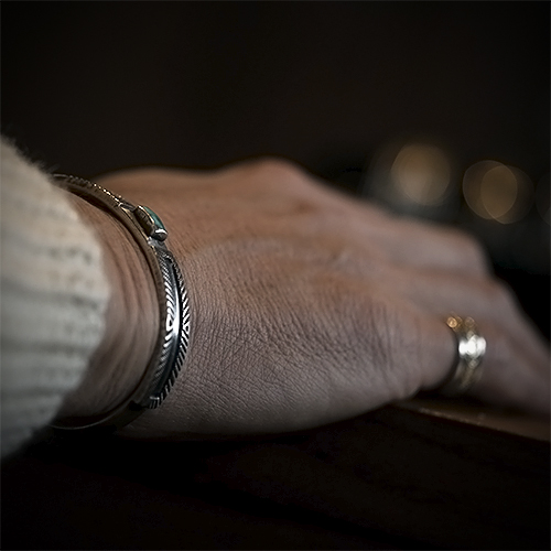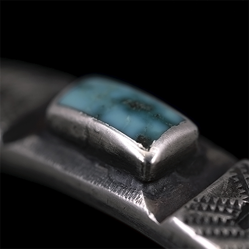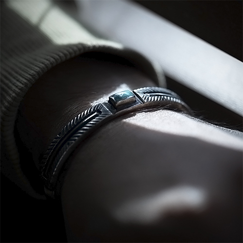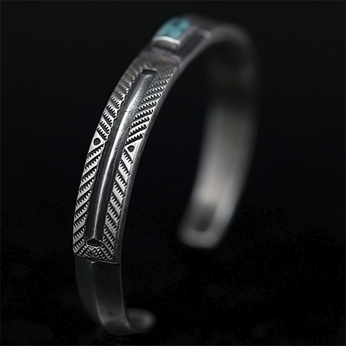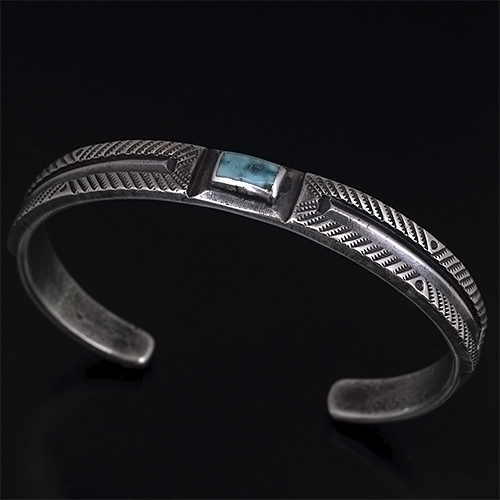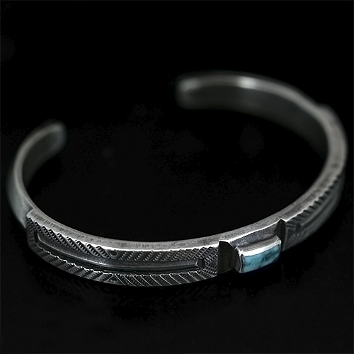 | Creek/クリーク族のアーティスト Jesse Robbins/ジェシー・ロビンズが制作したバングルです。 コインシルバーから成形された地金は単体でも重ね着けにも重宝する細身の幅になります。クラシックスタイルにセットされたターコイズは自らが採掘し厳選したシャイアンを使用しており、主張しすぎないサイズ感がバランスの良さを物語っています。素朴で落ち着いた雰囲気を感じる作品、大人のスタイルにシンプルに納まるバングルです。 ジェシー・ロビンズの世界観をどうぞお楽しみください。 |
