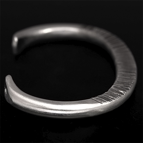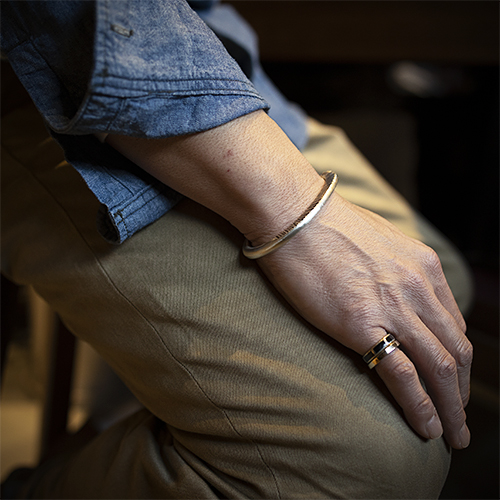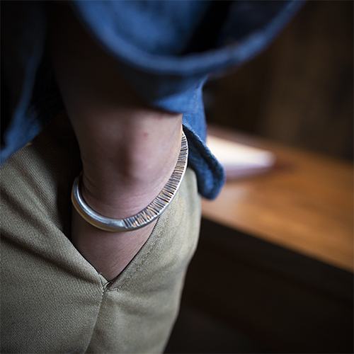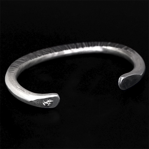 | Blackfoot/ブラックフット族のJames Faks/ジェームス・フォックスに制作を依頼しバングルです。 ラウンドワイヤーを使用した作品ですが、ハンマーで叩きながらオリジナルの形に成形されています。タガネで溝を創っていくチェイシングによるデザインはランダムに施されており、ジェームスの雰囲気がよく出た作品に仕上がっています。 幅は細く、厚みがある特徴的なスタイル、控え目な印象を与えつつも見る角度によっては主張感が生まれます。 単体で使用されるだけでなく、高低差をつけるための重ね着けのアイテムとしてもおすすめです。 |