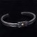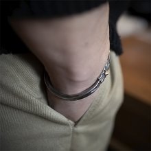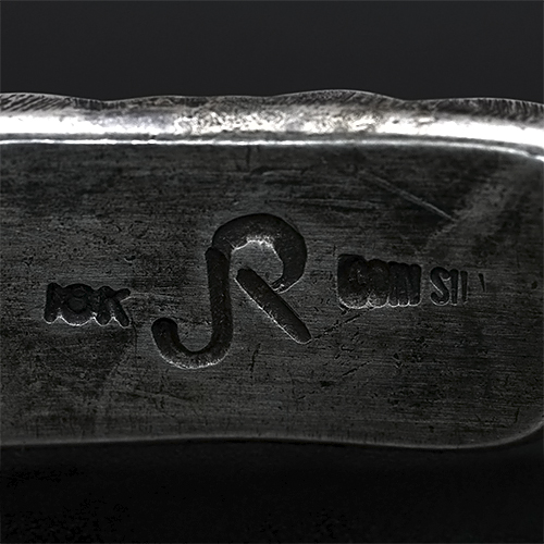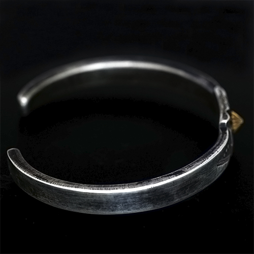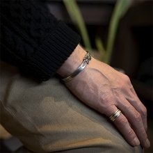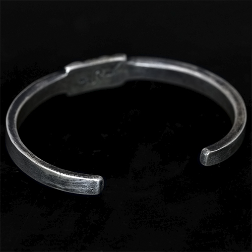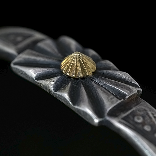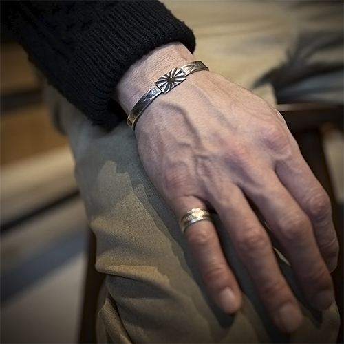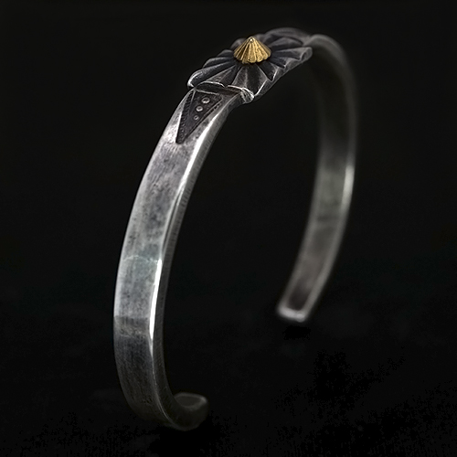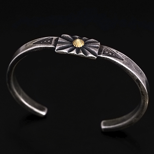 | Creek/クリーク族のアーティスト Jesse Robbins/ジェシー・ロビンズが制作したバングルです。 コインシルバーから成形された地金はサンバーストにデザインされ、コンチョには18Kを使用しています。コインシルバー特有の風格を感じさせ、全体的にシンプルにまとまった作品ですが、鈍い光沢に映える18Kがアクセントになります。幅が細くても作品のバランスを保つために地金の厚みは最大で約3.5mm、強度を兼ね備えています。 単体でもキレイにスタイルして頂けますが、幅の細いバングルと重ねて着けられるのにもお勧めです。 |