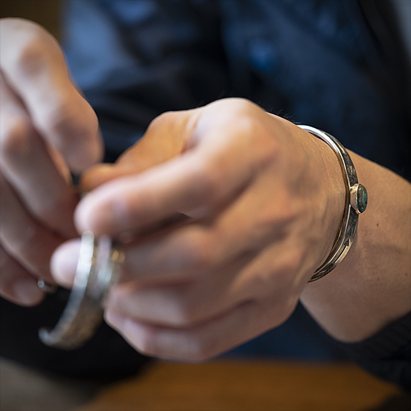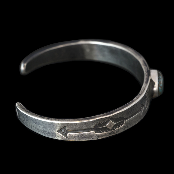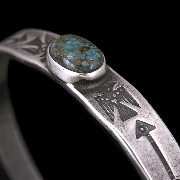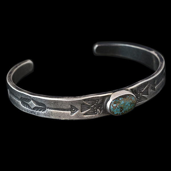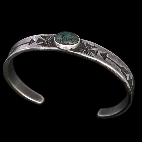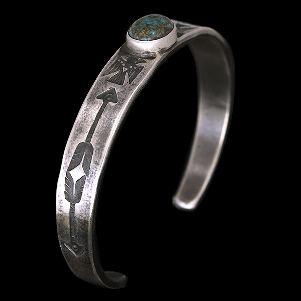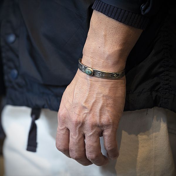 | Creek/クリーク族のアーティスト Jesse Robbins/ジェシー・ロビンズが制作したバングルです。 コインシルバーから成形された地金にはサンダーバード、アローがデザインされており、石はキャンデラリアがセットされています。コインシルバー特有の風格を感じさせ、鈍い光沢に映えるターコイズがアクセントになり、テーパー付きのすっきりとしたフォルムは着けた時のバランスの良さが窺えます。 単体でもキレイにスタイルして頂けますが、幅の細いバングルと重ねて着けられるのにもお勧めです。 |