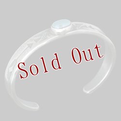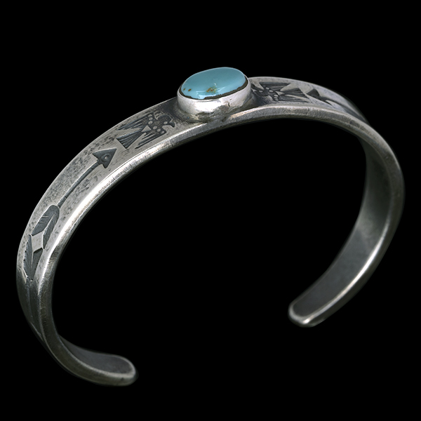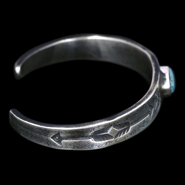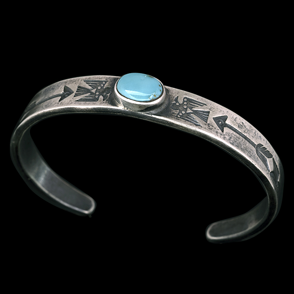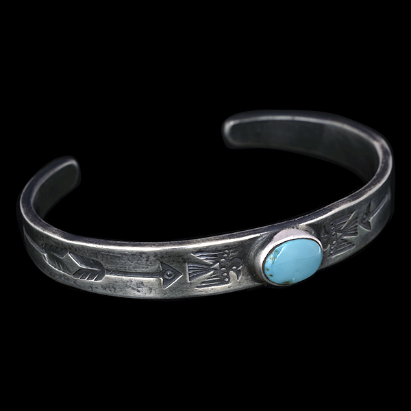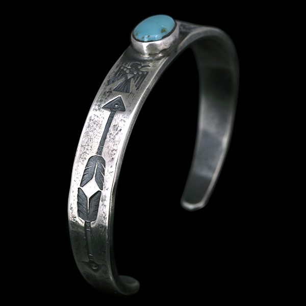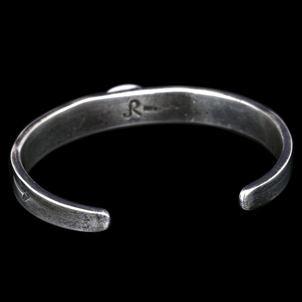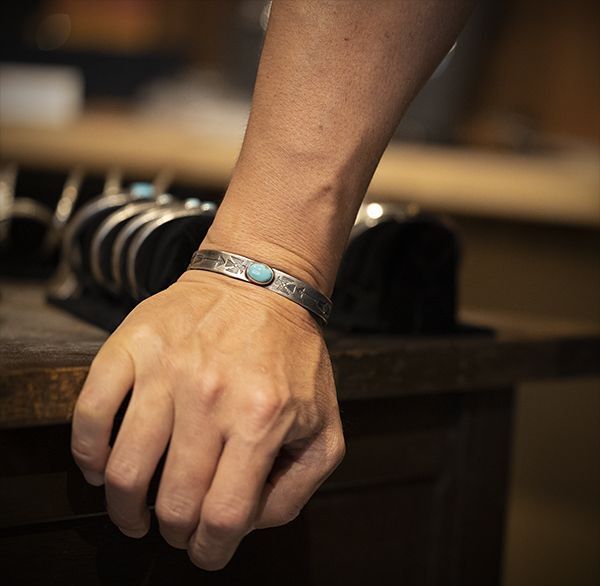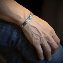 | Creek/クリーク族のアーティスト Jesse Robbins/ジェシー・ロビンズが制作したバングルです。 コインシルバーから成形された地金にはサンダーバード、アローがデザインされており、ターコイズは自らが採掘し厳選したシャイアンをセットすることで作品に色気を出しています。コインシルバー特有の風格を感じさせ、鈍い光沢に映えるターコイズがアクセントになり、テーパー付きのすっきりとしたフォルムは着けた時のバランスの良さが窺えます。 単体でもキレイにスタイルして頂けますが、幅の細いバングルと重ねて着けられるのにもお勧めです。 |