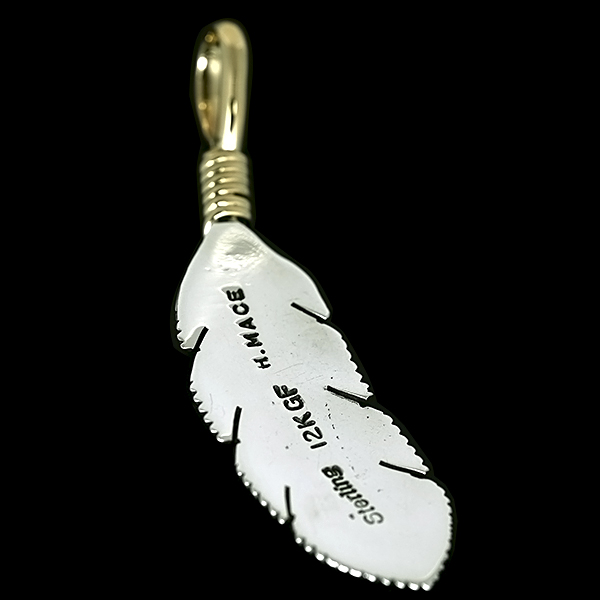 | NAVAJO/ナバホ族のアーティスト Harvey Mace/ハーヴィー・メイスに制作を依頼したペンダントです。 躍動感のあるフェザーモチーフの作品です。センターラインは12KGF(12金張り)が入っているため、洗練された落ち着いた魅力があり、シルバーとのバランスも絶妙です。 スタイルを問わない着けやすさはもちろんですが、さりげなくインディアンジュエリーをアピールする事が出来ますので、どなたでもお楽しみ頂ける作品です。 |