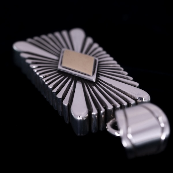 | NAVAJO/ナバホ族のアーティスト Patricia Bedonie/パトリシア・べドニーに制作を依頼したペンダントです。 正確で美しいチゼルワークによるサンバーストデザインです。ダイヤ型のパーツは14Kとシルバーのダブルダイヤモンドで仕上げていただきました。#1フラットワイヤー(約5mm厚)を使用していますが、厚みがあるため側面のエッジがより際立っているのがよく分かります。 すっきりとしたフォルムにラインの美しさとゴールドの輝きが印象的です。ホピチェーンなど雰囲気のあるチェーンと組み合わせて、力強さと繊細さ、バランスの整ったスタイルをお楽しみください。 |