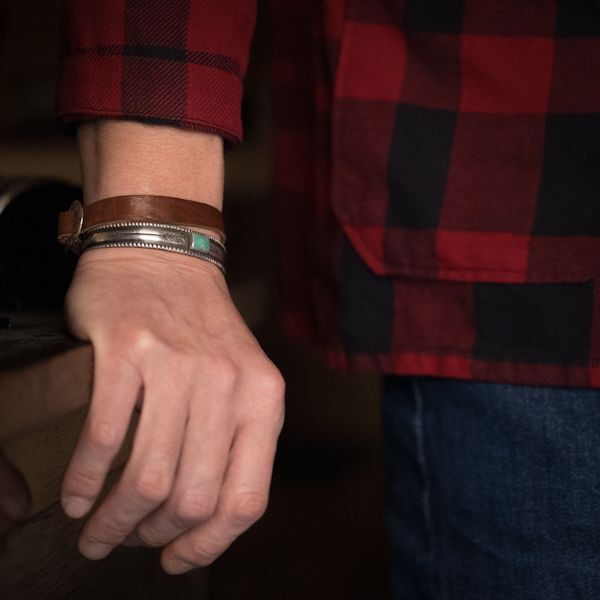 | Creek/クリーク族のアーティスト Jesse Robbins/ジェシー・ロビンズが制作したバングルです。 コインシルバーから成形された地金はチゼルワークによるデザイン、アローに挟まれる形でハ―クロス(ターコイズ)がセットされており、オールドスタイルに相応しい雰囲気と風格を感じます。 約11mm幅(テーパー)は使い勝手がよく、重ね着けにも重宝するため、様々な場面で洋服のアクセントとしてもご活用いただけます。またコインシルバー特有の風合いは経年変化とともに、より味わい深い作品へと変化していきますので、長年使用していく楽しみがあります。 素材の良さとジェシーが手掛けるオールドスタイルが上手く組み合わさっている作品、ジェシー・ロビンズの世界観をどうぞお楽しみください。 |