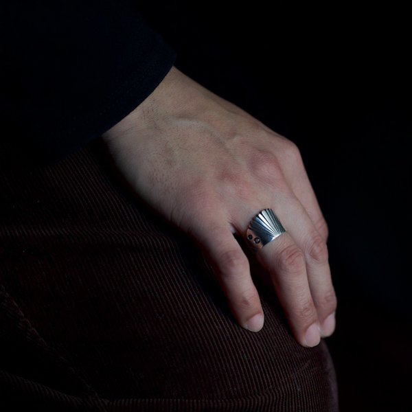 | NAVAJO/ナバホ族のアーティスト Jacob D. Morgan/ジェイコブ・モーガンに制作依頼をしたリングです。 12gaのシルバープレートを使用したイーグルデザインによる作品。スタンプワークによる尻尾、フェザー部分を表現し、つや消しの落ち着いた雰囲気が特徴的です。 着用するとイーグルに包み込まれるようなスタイルのリングになり、インディアンジュエリーらしいオールド感のあるデザインを感じつつも、現代的な雰囲気を持ち合わせています。 美しい曲線と丁寧な仕事ぶりからジェイコブ・モーガンの性格を感じ取っていただけます。 |