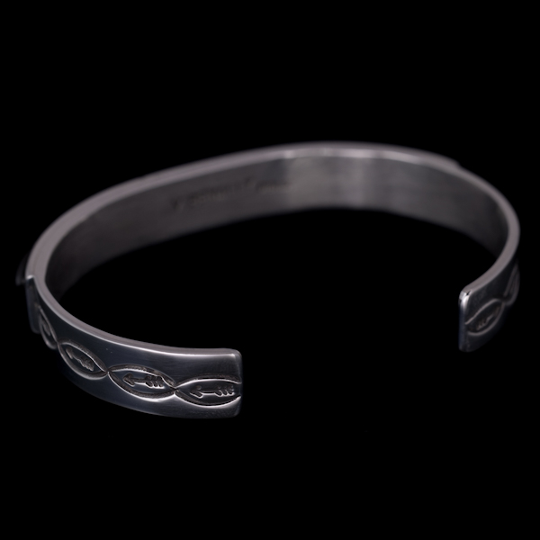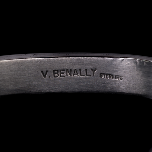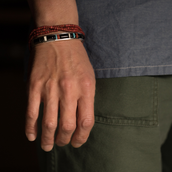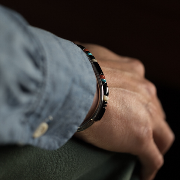 | NAVAJO/ナバホ族のアーティスト Veronica Benally/ベロニカ・ベナリーによるバングルです。 インレイ技法を用いて一つ一つ丁寧にカットしたストーンを幅10mmの中にセットし表現しています。女性アーティストならではの美しい配色は目を引くだけでなく、自然に洋服に取り入れることできるどこか落ち着いた雰囲気、アクセントとしても映える作品です。 ベーシックにシングルで取り入れていただくのも差し色としてよし、細身で高さのあるシンプルなバングルと重ね着けするスタイルなど、他のアイテムとの強弱をつけるのにもおすすめです。 |