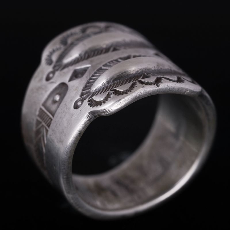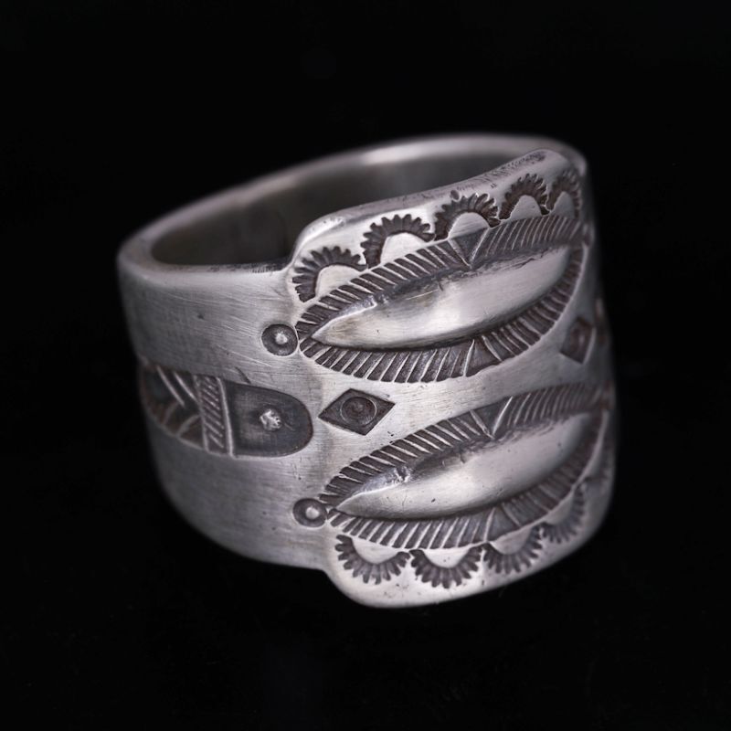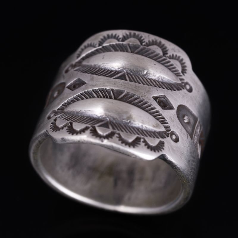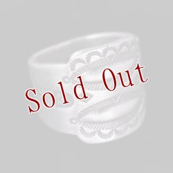 | Creek/クリーク族のアーティスト Jesse Robbins/ジェシー・ロビンズが制作したリングです。 コインシルバーから成形された地金はバンプアウト(打ち出し)によるデザインが印象的、伝統的なスタイルとともにインディアンジュエリーの奥深さを感じる作品からは古き良きスタイルという言葉がはまります。 コインシルバー特有の風合いは経年変化とともに、より味わい深い作品へと変化していきますので、長年使用していく楽しみがあります。 素材の良さとジェシーが手掛けるオールドスタイルが上手く組み合わさっている作品、ジェシー・ロビンズの世界観をどうぞお楽しみください。 |