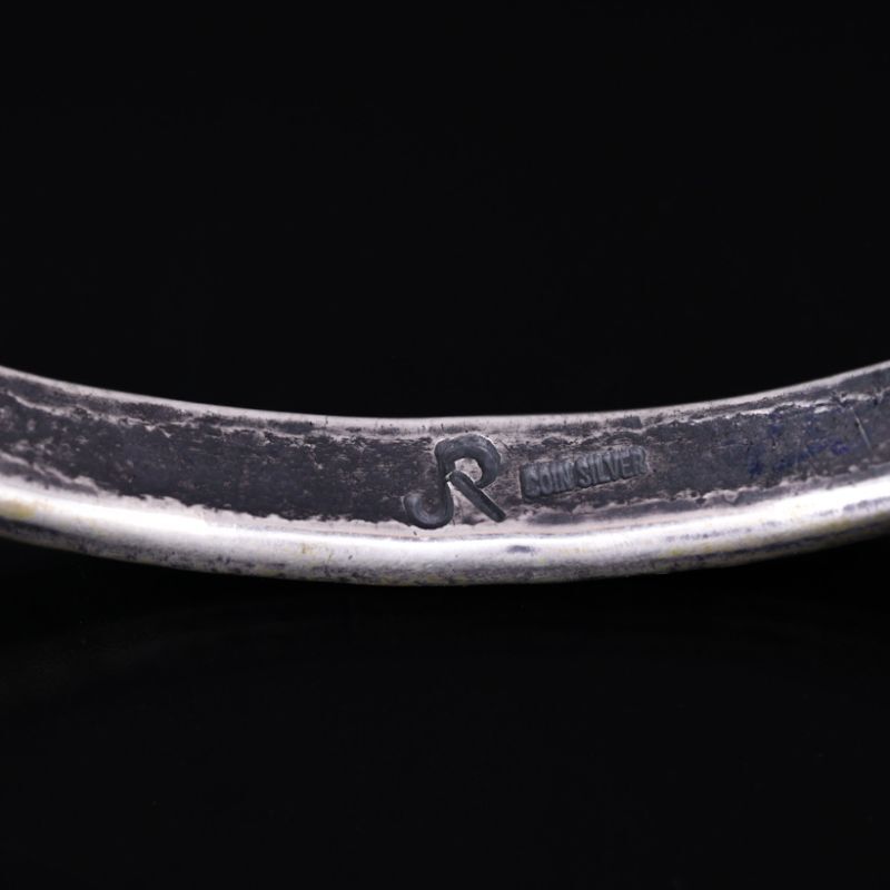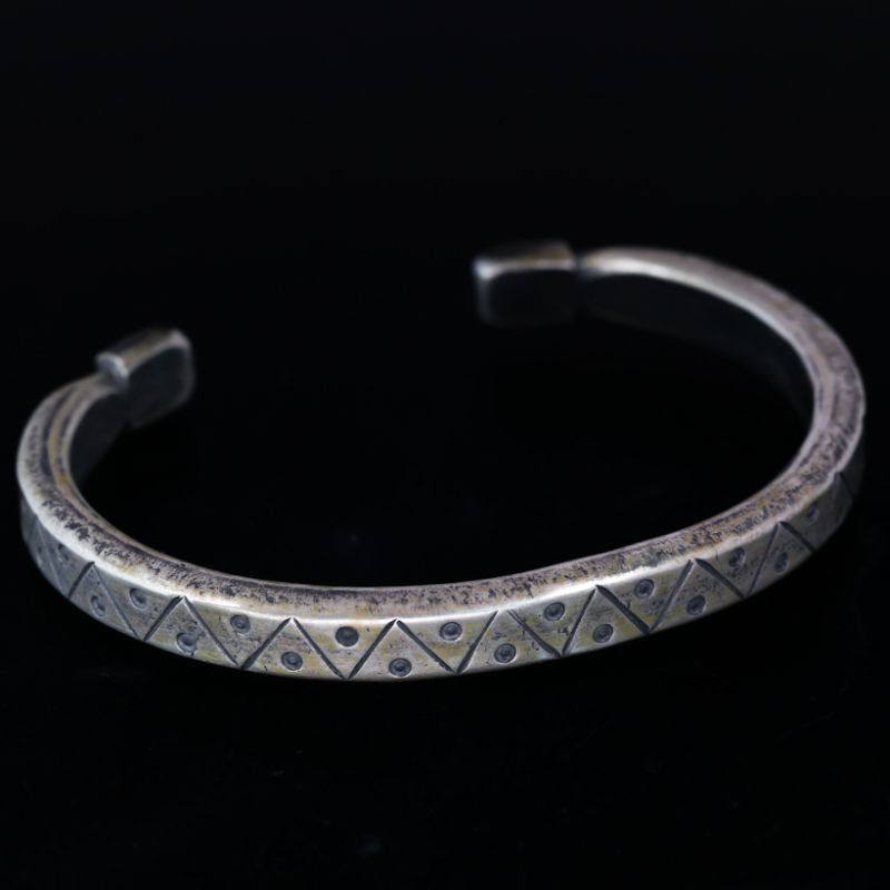 | Creek/クリーク族のアーティスト Jesse Robbins/ジェシー・ロビンズが制作したバングルです。 コインシルバーから成形された地金は、細身で厚みのあるしっかりと重厚感を感じることが出来ます。特報的なジグザグデザインが作品の風合いをより増しており、どこか落ち着いたしずかな雰囲気がスタイルの良さを際立たせます。 コインシルバー特有の風合いは経年変化とともに、より味わい深い作品へと変化していきますので、長年使用していく楽しみがあります。 素材の良さとジェシーが手掛けるオールドスタイルが上手く組み合わさっている作品、ジェシー・ロビンズの世界観をどうぞお楽しみください。 |