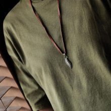 | Creek/クリーク族のアーティスト Jesse Robbins/ジェシー・ロビンズによるペンダントです。 コインシルバーから成形された地金は、細身で厚みのあるしっかりと重厚感を感じることが出来ます。特報的なジグザグデザインが作品の風合いをより増しており、どこか落ち着いたしずかな雰囲気がスタイルの良さを際立たせます。 コインシルバー特有の風合いは経年変化とともに、より味わい深い作品へと変化していきますので、長年使用していく楽しみがあります。 素材の良さとジェシーが手掛けるオールドスタイルが上手く組み合わさっている作品、ジェシー・ロビンズの世界観をどうぞお楽しみください。 |