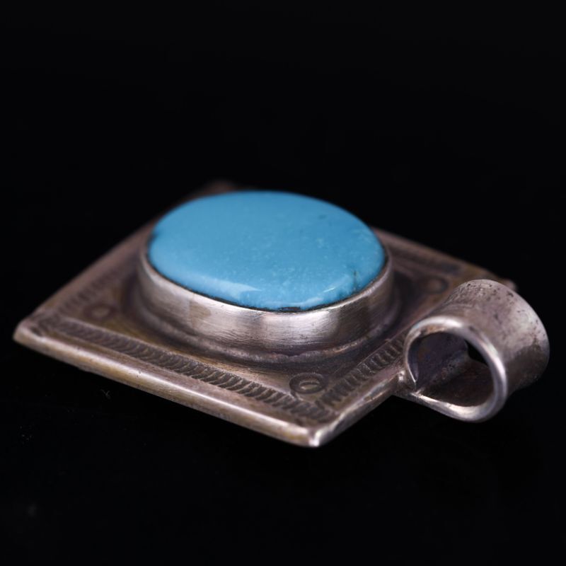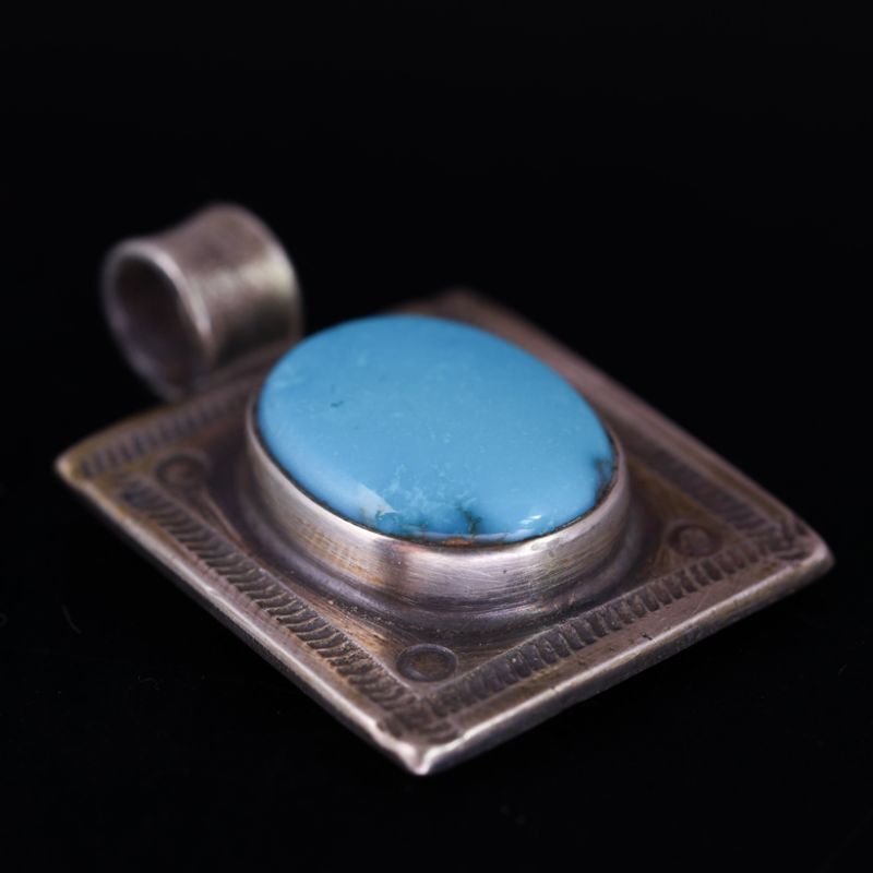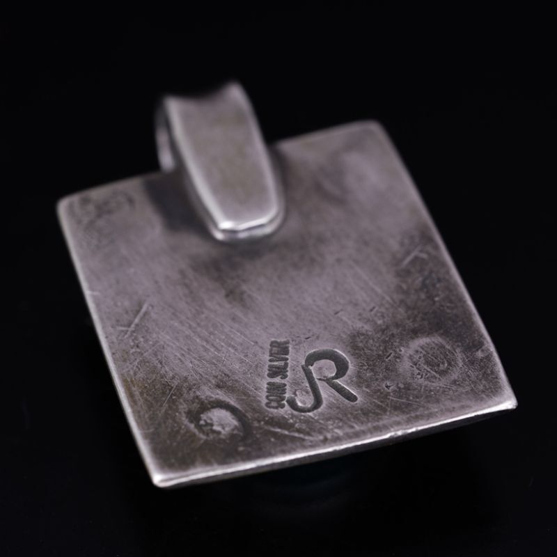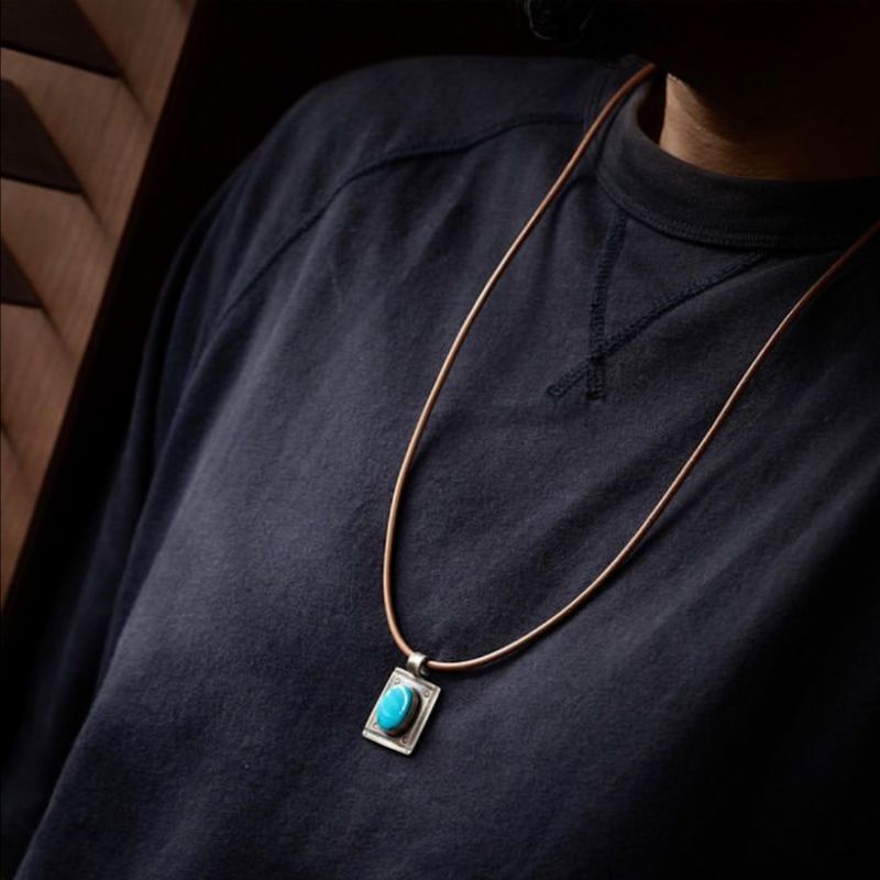 | Creek/クリーク族のアーティスト Jesse Robbins/ジェシー・ロビンズによるペンダントです。 コインシルバーから成形された地金にキャンデラリア(ターコイズ)がセットされています。スクエア型のベーシックな形はスタイルを選ばない着けやすさがあり、着用画像は丸レースのナチュラルで長めに合わせています。コインシルバー特有の風合いは経年変化とともに、より味わい深い作品へと変化していきますので、長年使用していく楽しみがあります。 素材の良さとジェシーが手掛けるオールドスタイルが上手く組み合わさっている作品、ジェシー・ロビンズの世界観をどうぞお楽しみください。 丸レースをご希望される場合は事前にお問合せください。 |
