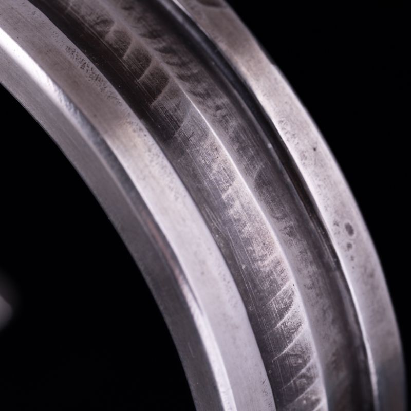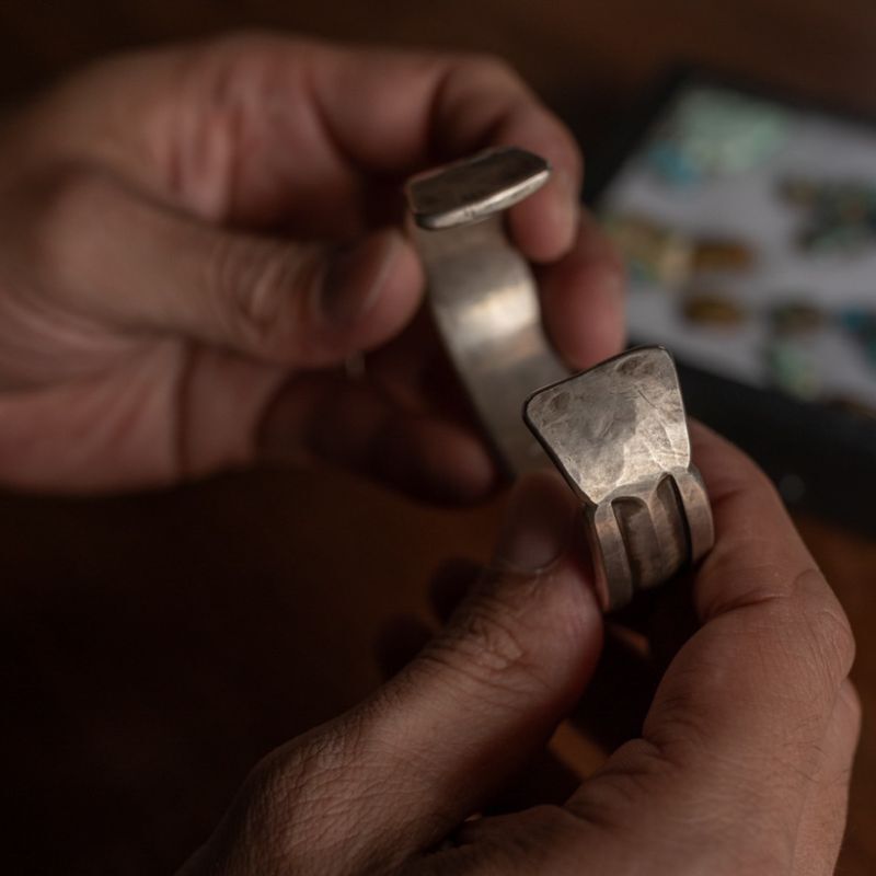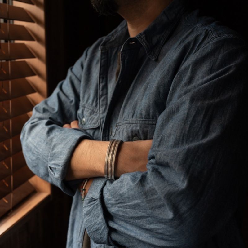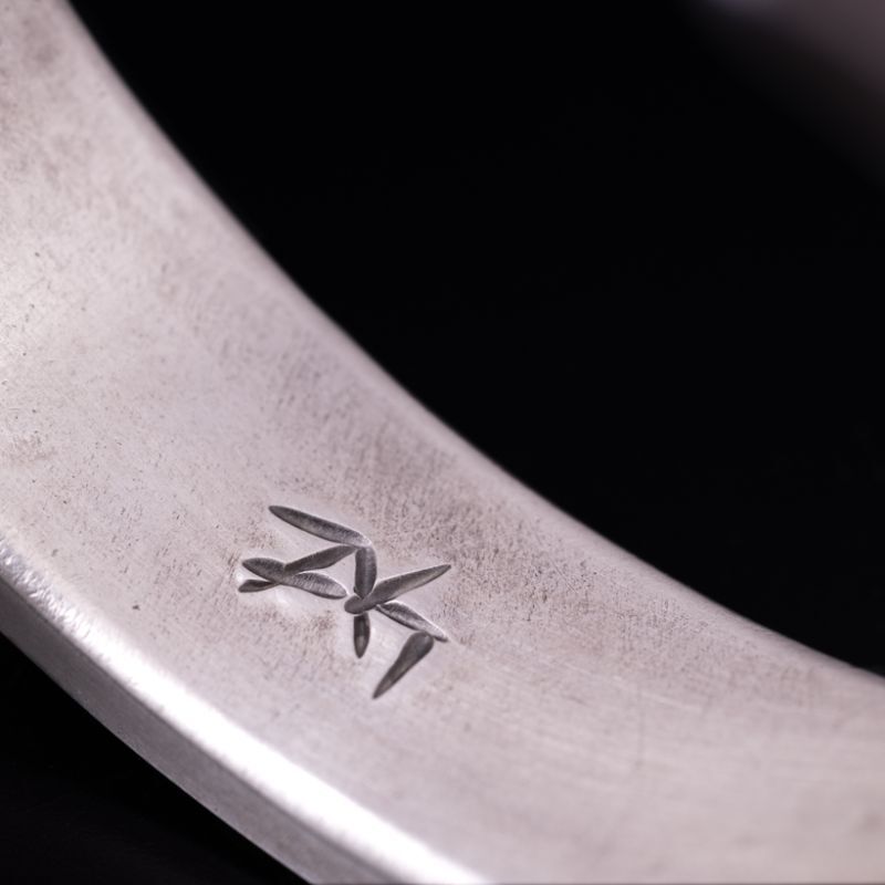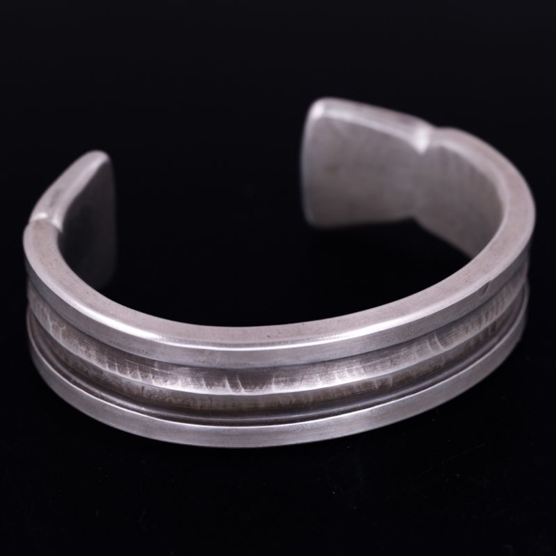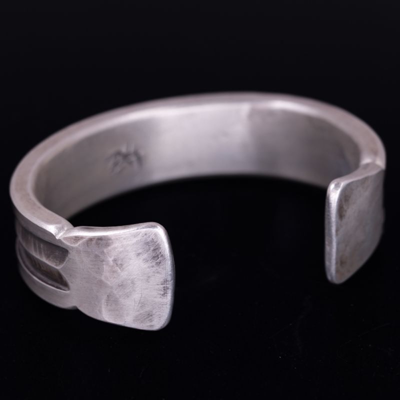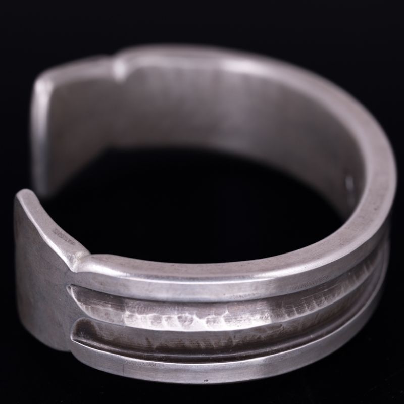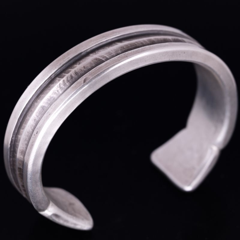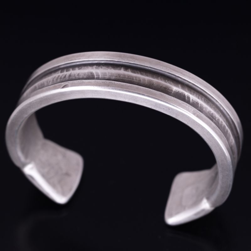 | Blackfoot/ブラックフット族のJames Faks/ジェームス・フォックスに制作を依頼しバングルです。 タガネで溝を創っていく"チェイシング"と言われる技法を用いた作品です。中心は山型に成形されており、派手さはなく素朴でクリーンな印象です。タガネを少しずつハンマーで叩きながら動かしていくため断面に凹凸が生まれています。 ゴツゴツとした分厚いシルバーの塊のようなバングルですが、エッジの処理など細かいところまで行きとどいていますので、装着感はとても柔らかく感じます。 ターミナルはハンマーで叩かれ薄くされているのが特徴で、幅が一番広い所でもあり着けた時のホールド感がしっかりと感じます。また叩いた跡がデザインにもなる簡素なお洒落です。 シンプルで派手さはない分スタイルに自然に溶け込む作品です。 |
