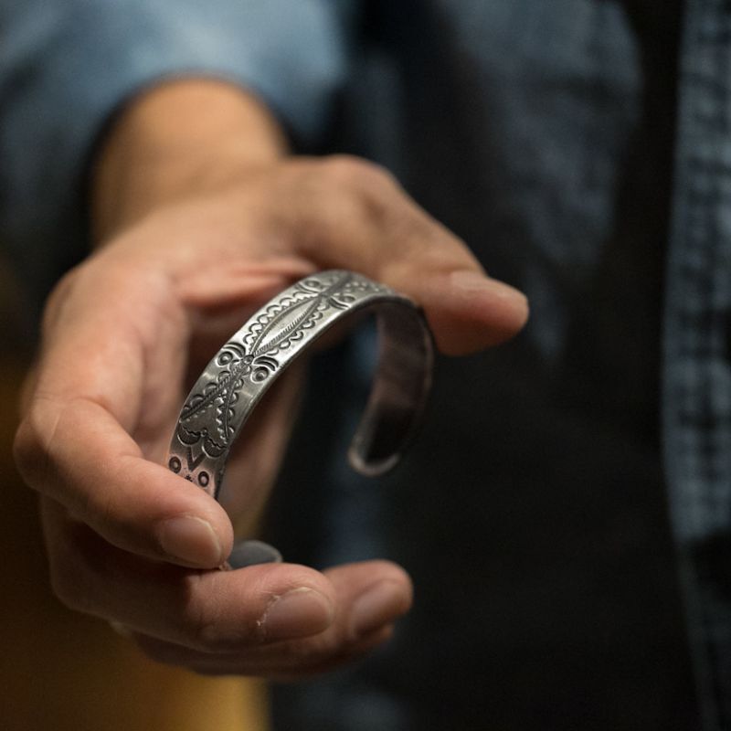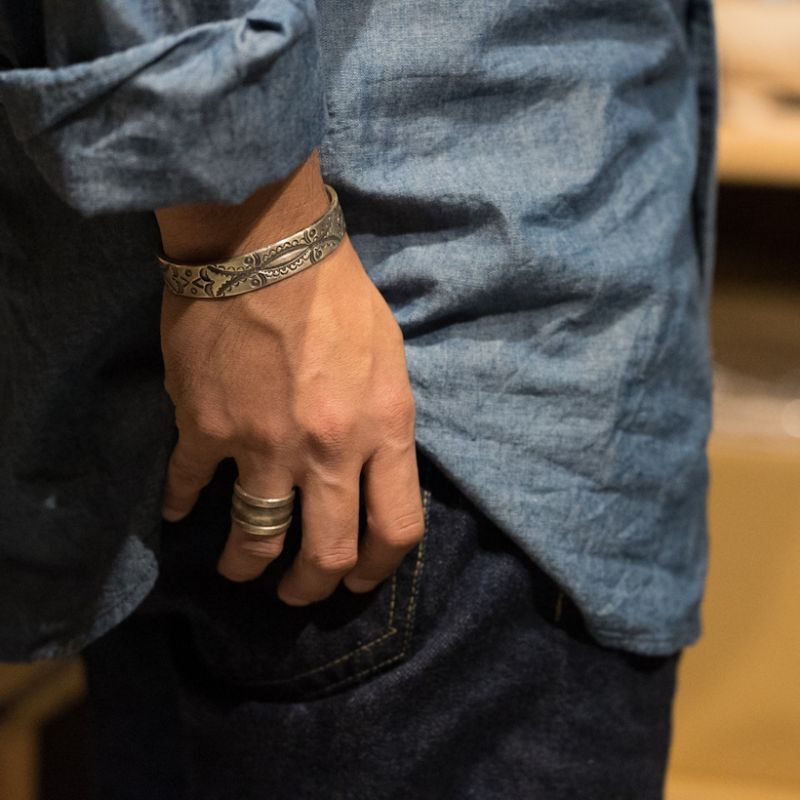 | Creek/クリーク族のアーティスト Jesse Robbins/ジェシー・ロビンズが制作したバングルです。 コインシルバーから成形された地金は、細身で厚みのあるしっかりと重厚感を感じることが出来ます。特報的なジグザグデザインが作品の風合いをより増しており、どこか落ち着いたしずかな雰囲気がスタイルの良さを際立たせます。 コインシルバー特有の風合いは経年変化とともに、より味わい深い作品へと変化していきますので、長年使用していく楽しみがあります。 素材の良さとジェシーが手掛けるオールドスタイルが上手く組み合わさっている作品、ジェシー・ロビンズの世界観をどうぞお楽しみください。 |