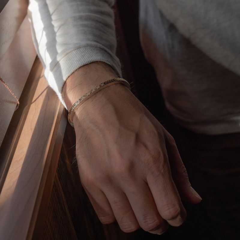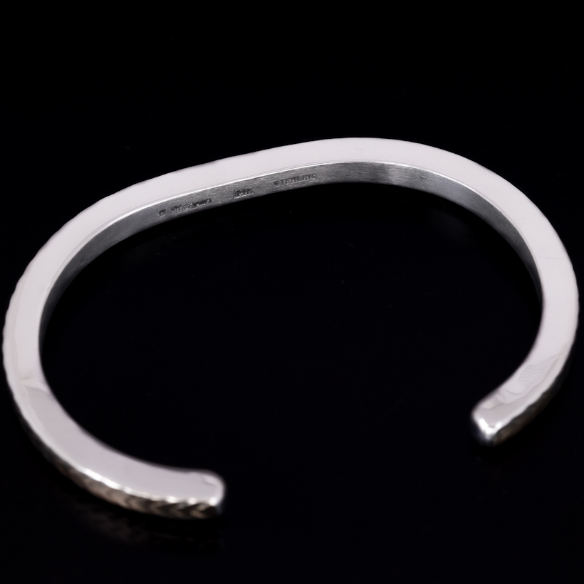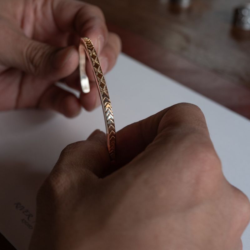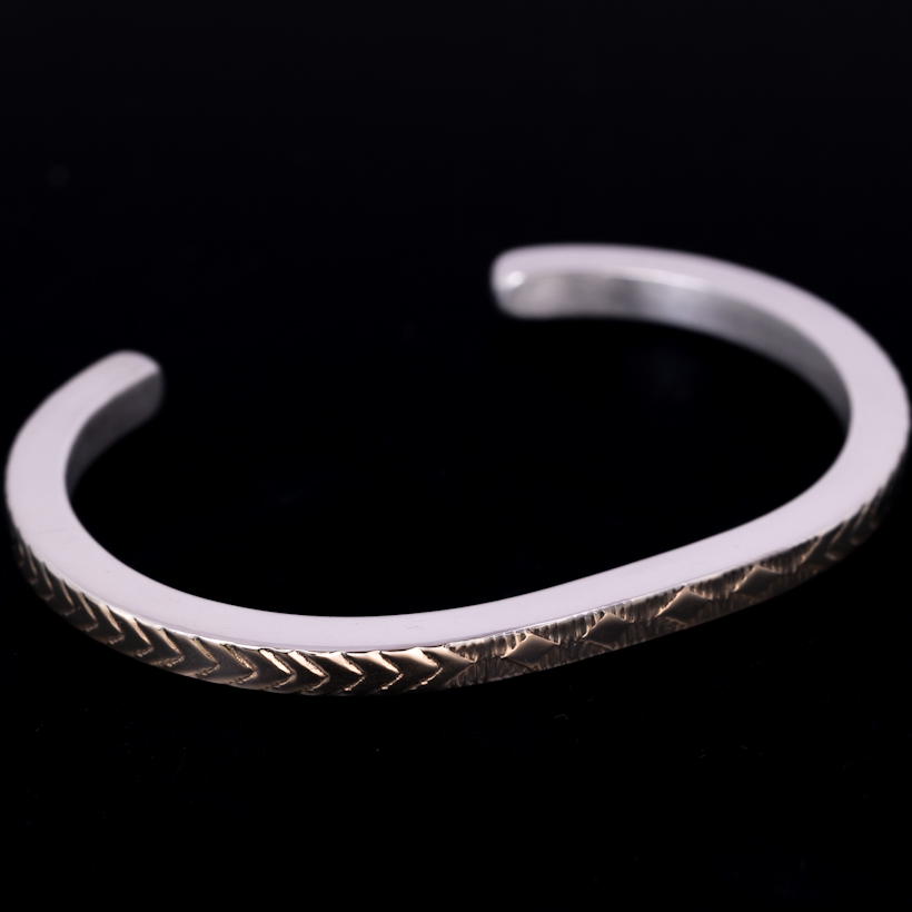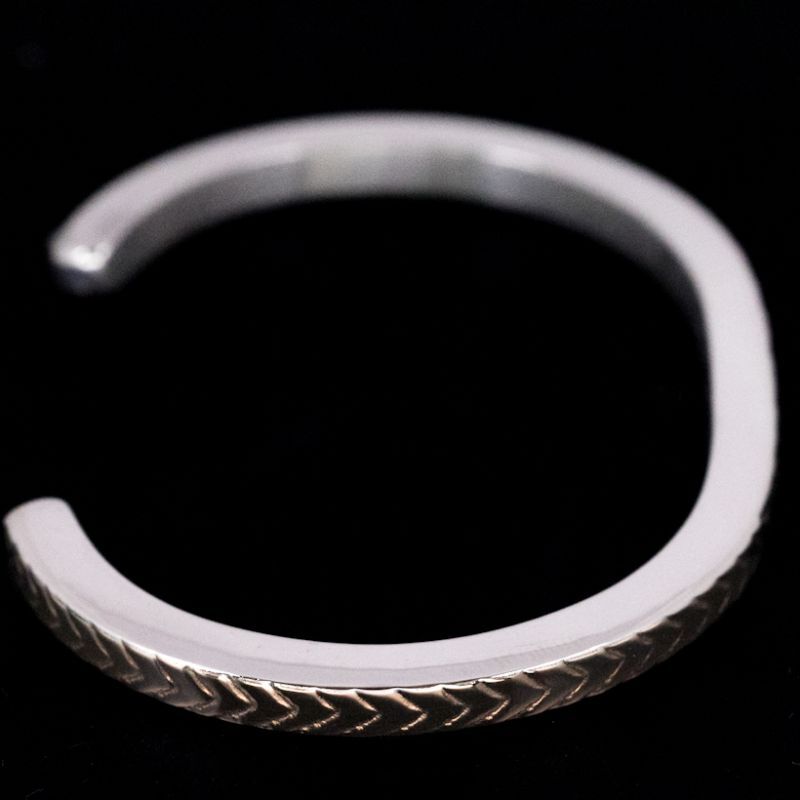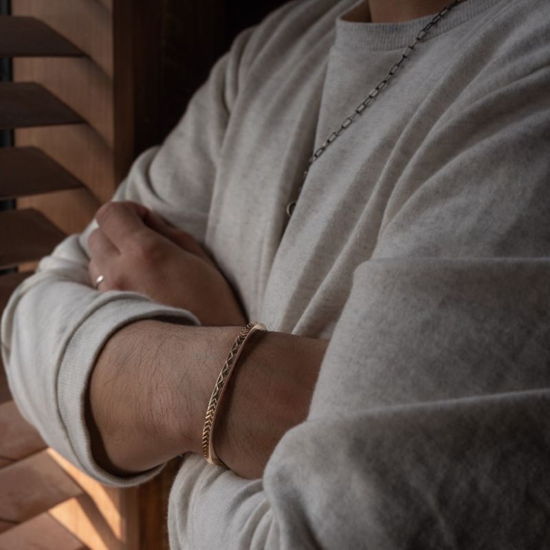 | NAVAJO/ナバホ族のBruce Morgan/ブルース・モーガンに制作を依頼しバングルです。 厚み幅ともに約4mmのスクエアワイヤーを使用し、表面(1面)に14Kを張り付けたRIVER MAIL企画による作品です。表面にはスタンプワークによるダイヤ+アローをデザインしていただきました。どんな服装にも取り入れることが出来る簡素な美を追及したアイテムです。 単体でお使い頂くのも良いですが、他のバングルと重ね着けにも重宝する作品になりますので、様々なスタイルでお楽しみください。 |